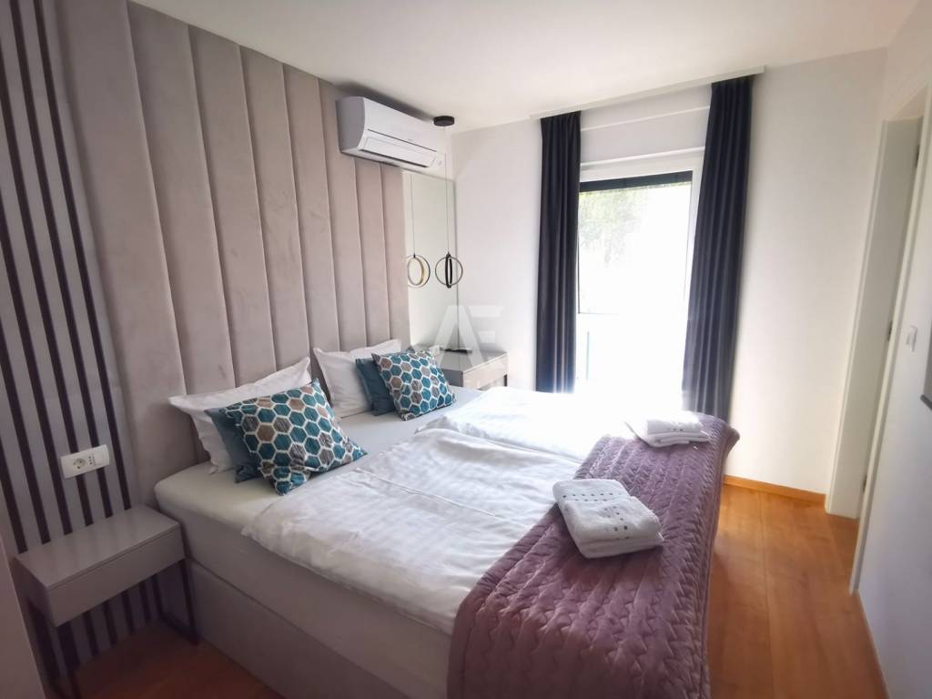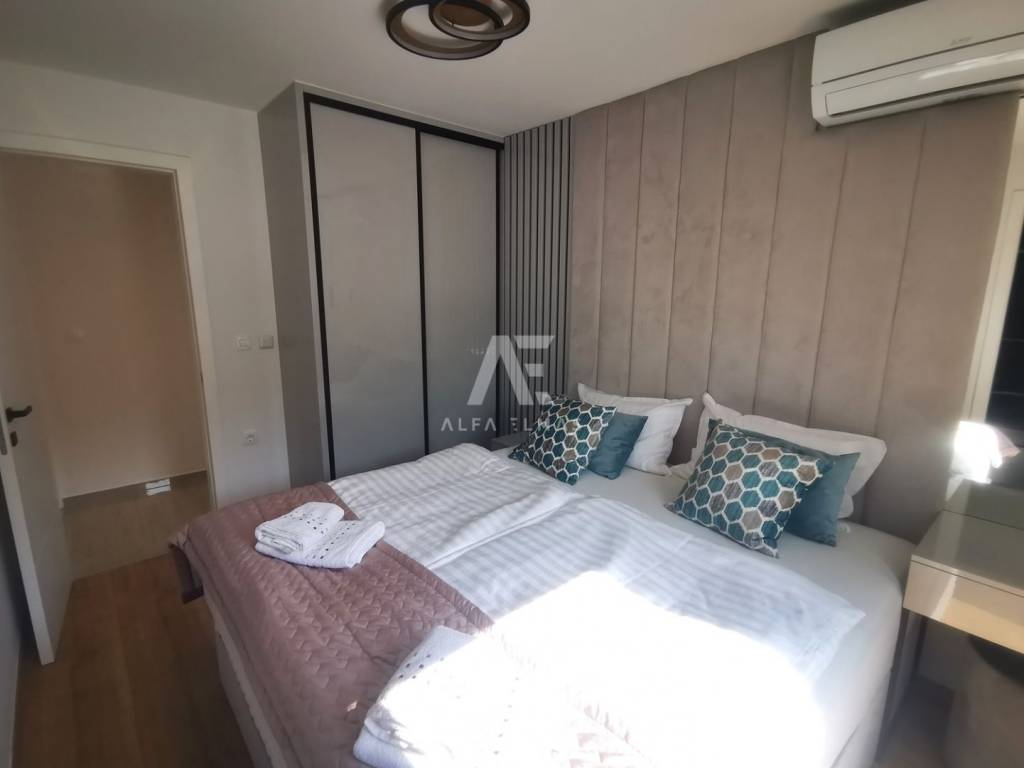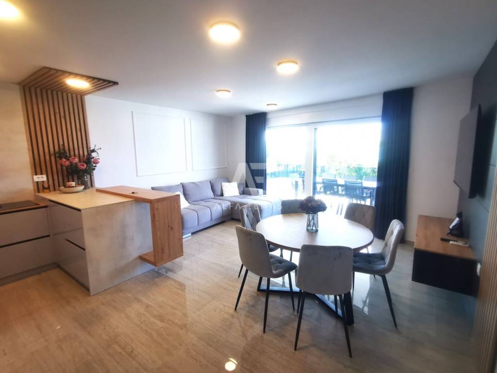 Apartman se sastoji od dnevnog boravka, kuhinje i blagovaone koji su objedinjeni u open space stilu, 3 spavaće sobe, tri kupaonice , WC-a. Iz dnevnog boravka sa panoramskim otvorima, izlazi se na natkrivenu terasu od 15m2 sa koje se pruža prekrasan otvoreni te nezagradiv pogled ne more.