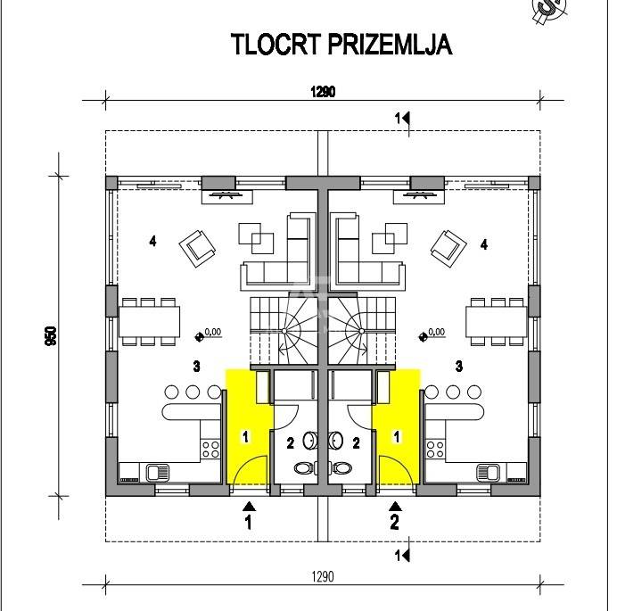 Prizemlje: Hodnik, kupaonica, kuhinja s blagovaonicom, dnevni boravak s izlazom na uređenu okućnicu