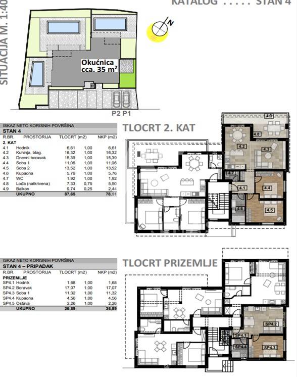 Glavni, dvosobni apartman prostire se na 78,51 četvornih metara i obuhvaća ulazni hodnik, dvije spavaće sobe, kupaonicu, zaseban toalet, kuhinju, blagovaonicu i prostrani dnevni boravak s izlazom na natkriveni balkon. Prostor je pažljivo projektiran kako bi osigurao maksimalnu funkcionalnost i ugodan boravak, uz obilje prirodne svjetlosti i pogled prema mirnom okruženju.