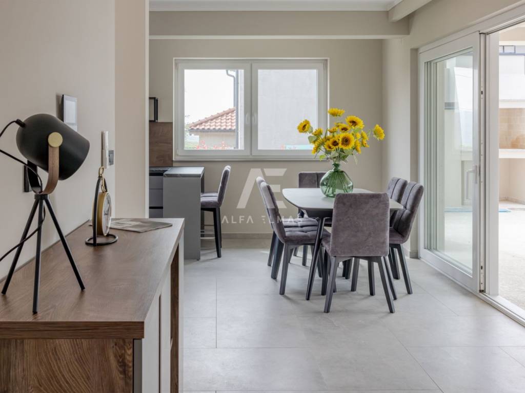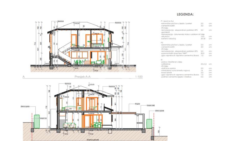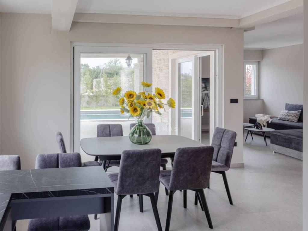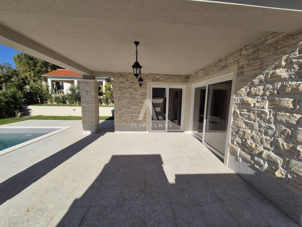 Prizemlje: Prostrano i svijetlo, s otvorenim prostorom za kuhinju, blagovaonicu i dnevni boravak. S prizemlja se izlazi na veliku natkrivenu terasu koja vodi prema bazenu.