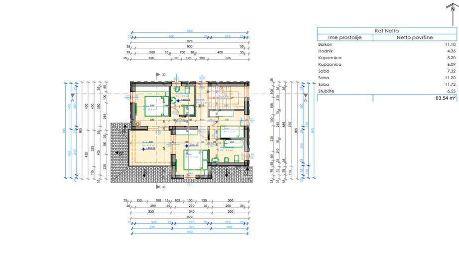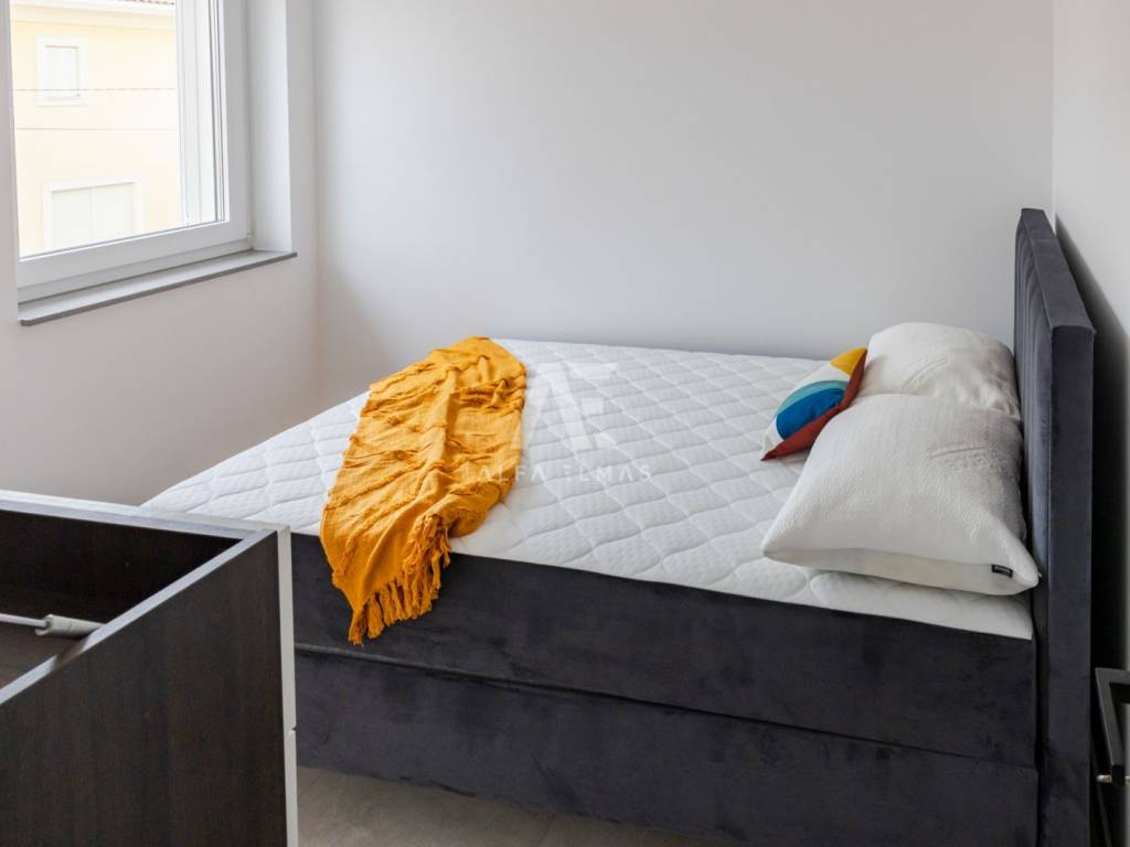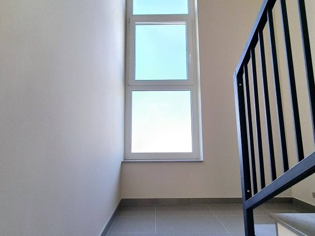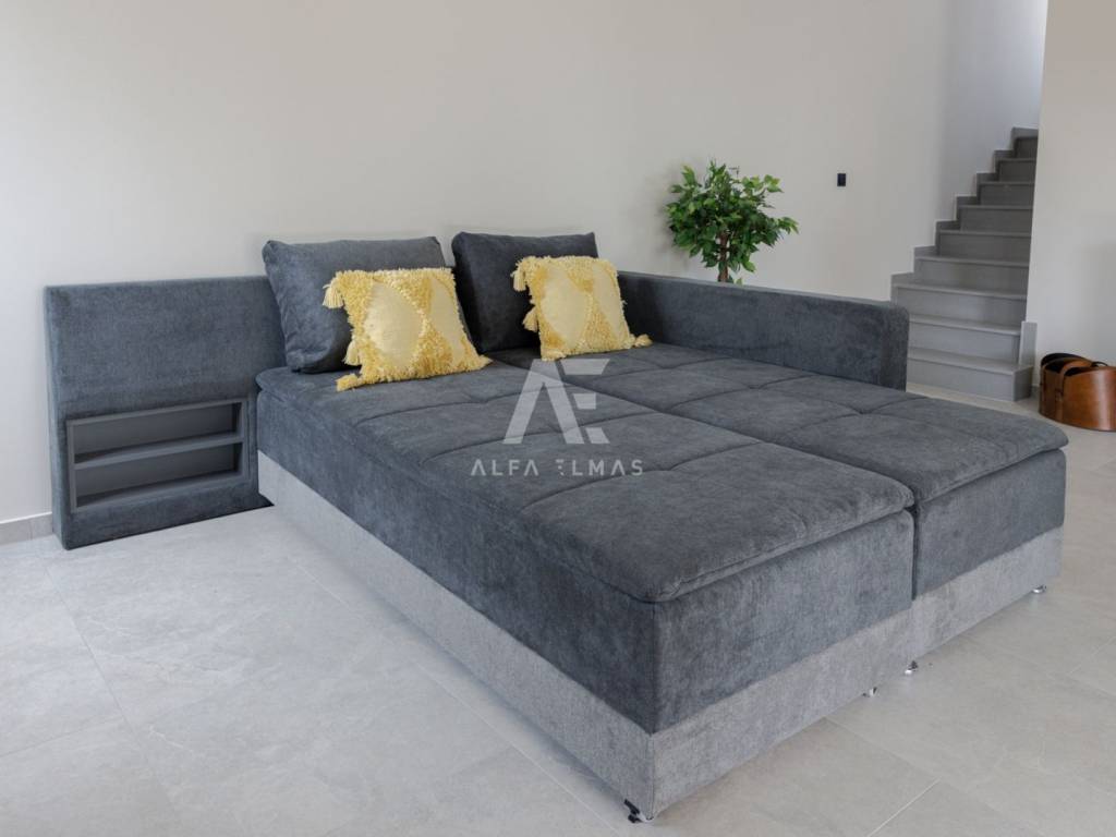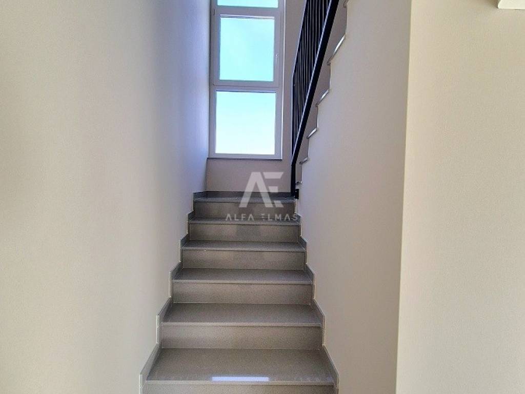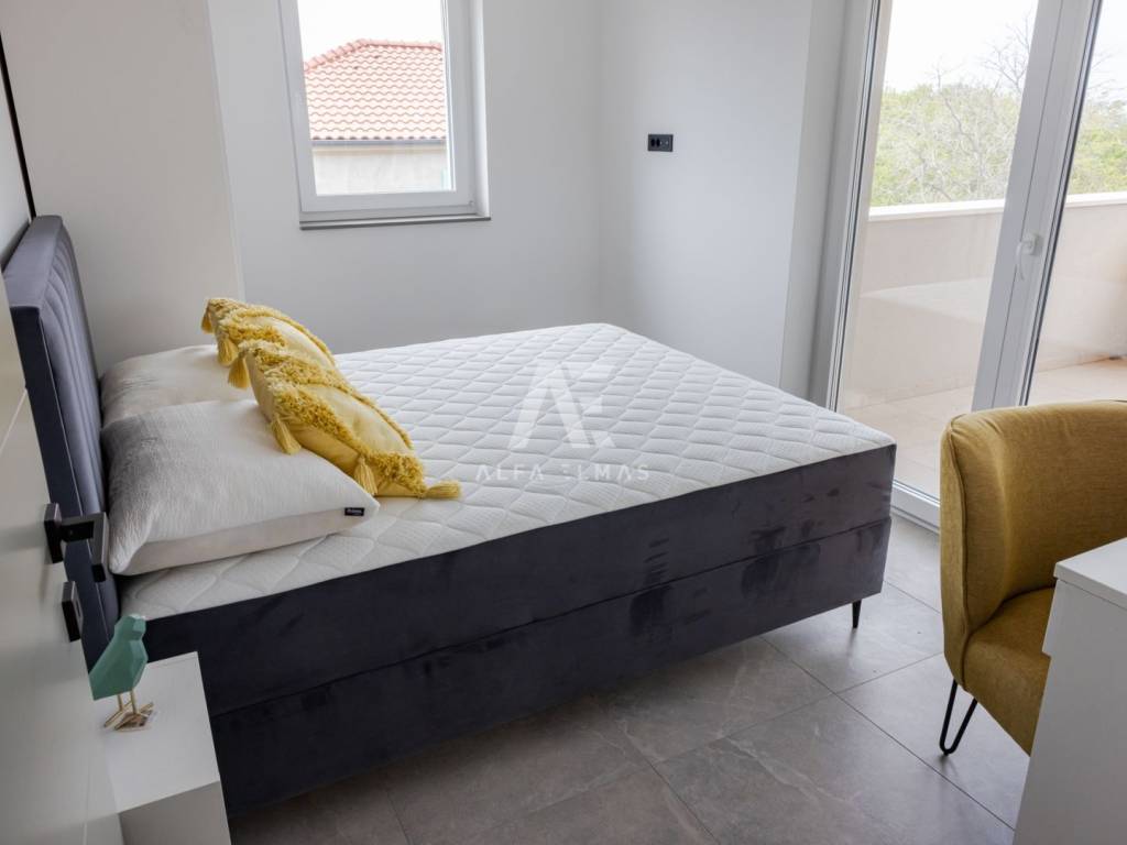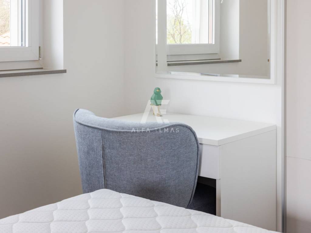 Kat: 3 prozračne spavaće sobe, od kojih jedna ima vlastitu kupaonicu s walk-in tuš kabinom i izlazom na vanjsku natkrivenu terasu. Na katu se također nalazi jedna dodatna kupaonica.