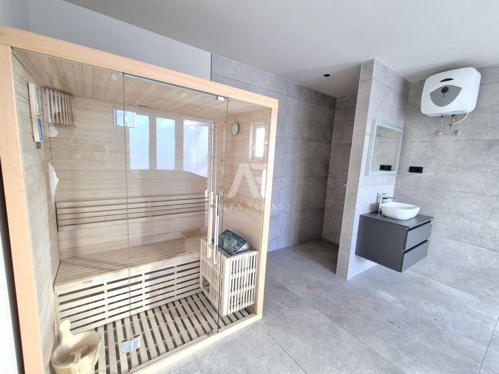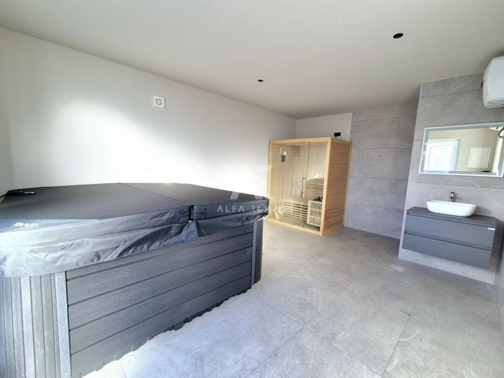 Vanjski prostor: U sklopu vile nalazi se pomoćni objekt s saunom, jacuzzijem i tušem te zidani roštilj obložen kamenom uz natkrivenu terasu za ugodna druženja i obiteljske večere na otvorenom. Osim toga, vrt je obogaćen mediteranskim biljem i zelenim površinama, uz sustav za navodnjavanje.