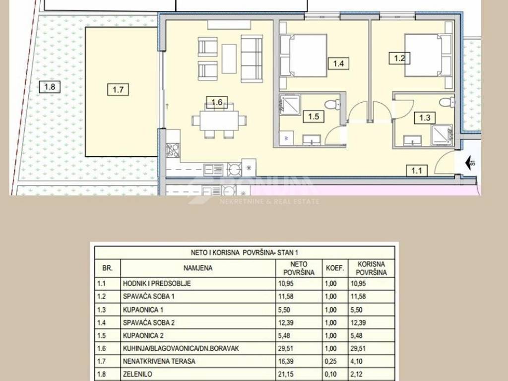 Stan S1 u prizemlju predstavlja savršen spoj modernog dizajna i udobnosti na mirnoj lokaciji u Srimi, svega 50 metara od mora i uređene plaže. Ukupne korisne površine 81,63 m², ovaj apartman nudi dvije spavaće sobe, dvije kupaonice te prostran dnevni boravak s kuhinjom i blagovaonicom. Posebna vrijednost stana je nenatkrivena terasa površine 16,39 m² i vrt od 21,15 m², idealni za opuštanje na otvorenom u mediteranskom ambijentu. Stanu pripada i jedno parkirno mjesto, a udaljenost do centra mjesta iznosi svega 950 metara.