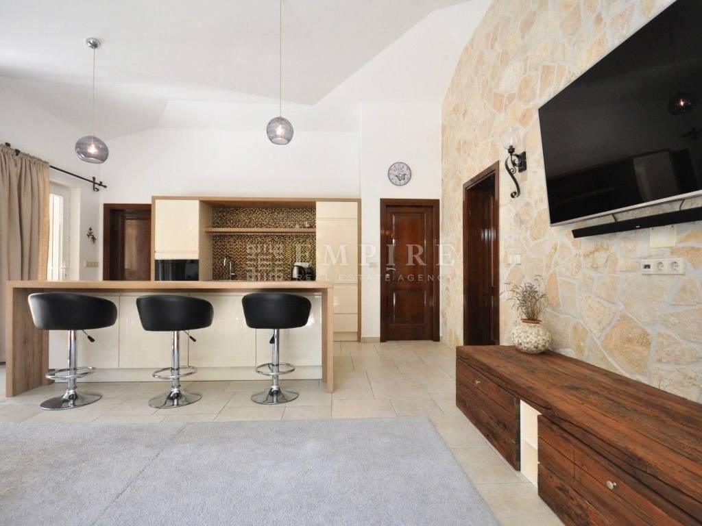 Kuća je izgrađena 2013. godine i izvanredno održavana – odmah useljiva, bez dodatnih ulaganja. Opremljena je klima uređajima za grijanje i hlađenje, podnim grijanjem u kupaonicama, PVC stolarijom s komarnicima i tradicionalnim drvenim griljama (škure) koje štite od sunca i daju kući mediteranski šarm.