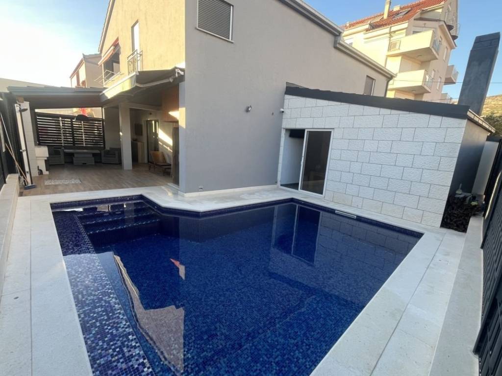 Svijetla, prozračna i odmah dostupna, ova luksuzna vila smještena na pješačkoj udaljenosti od povijesne jezgre grada Trogira čeka nove najmoprimce. Nekretnina je u potpunosti obnovljena i potpuno opremljena, pri čemu je posebna pažnja posvećena svakom detalju unutarnjeg i vanjskog uređenja te svim nadogradnjama. Vila raspolaže s pet spavaćih soba, od kojih svaka ima vlastitu klimatizacijsku jedinicu, dvije kupaonice, dva odvojena dnevna boravka, također s individualnim klima-uređajima, kao i bazenom u prostranom dvorištu opremljenom vrhunskim vrtnim namještajem, idealnim za druženja i uživanje u dalmatinskom ugođaju. Podno grijanje u cijelom objektu pruža dodatnu razinu udobnosti tijekom hladnijih mjeseci. Boravak zrelih kućnih ljubimaca male ili srednje veličine dozvoljen je. Troškove režija i održavanja bazena snosi najmoprimac. Nekretnina je dostupna za dugoročan najam.