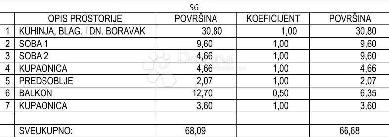 Stan ukupne neto korisne površine 66 m prostire se na ulazni hodnik, prostrani dnevni boravak s kuhinjom i blagovaonicom u otvorenom planu, dvije udobne spavaće sobe te dvije luksuzne kupaonice. Veliki prozori omogućuju obilje prirodne svjetlosti, a iz dnevnog boravka izlazi se na natkrivenu terasu površine 12,70 m s koje se pruža fantastičan pogled na more idealno za uživanje u jutarnjoj kavi ili opuštanje nakon napornog dana.