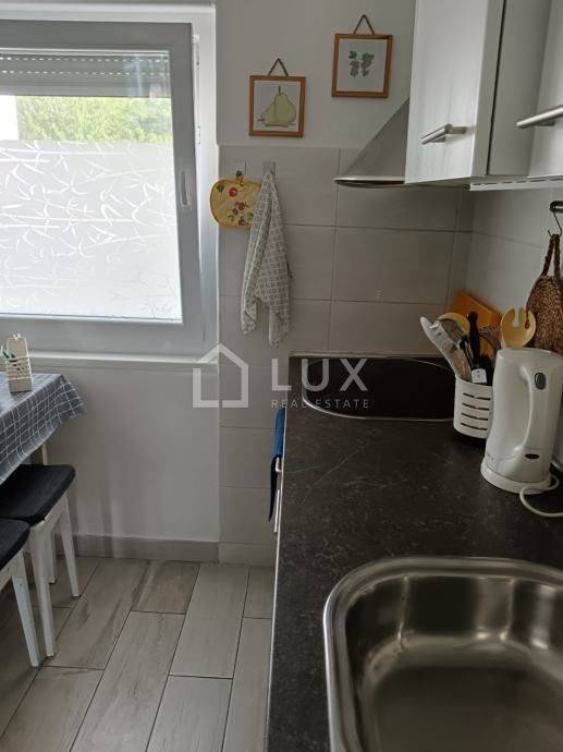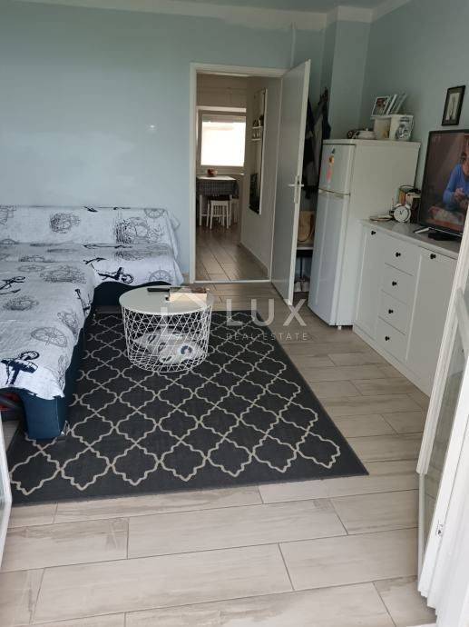 Centar nekretnine uključzje veliku dnevnu sobu s kuhinjom i blagovaonicom, spavaću sobu, kupaonicu te lođu s predivnim pogledom na more i otok Krk - savršeno mjesto za jutarnju kavu ili večernjee uživanje uz zalazak sunca.
