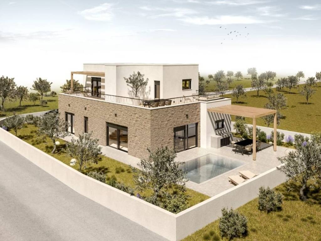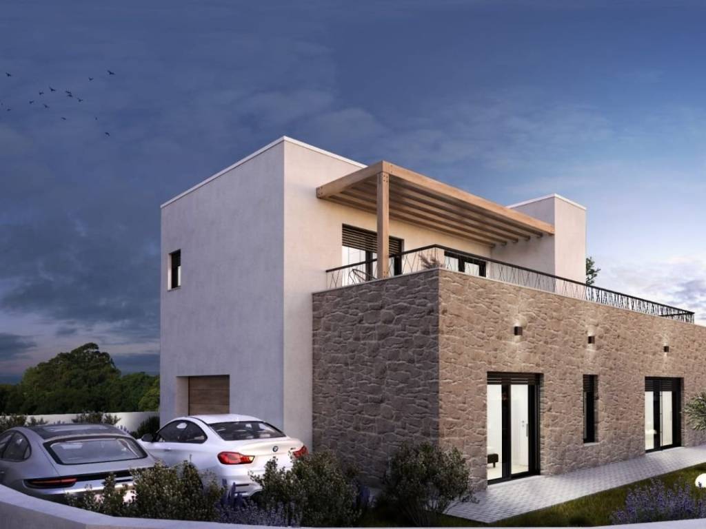 Prodaje se novosagrađena obiteljska kuća. Nalazi se na mirnoj obiteljskoj lokaciji idealnoj za život. Okučnica se sastoji od 3 vanjska parkirna mjesta i nesmetanog ulaza u garažu, bazen, roštilj, vanjski tuš i natkrivena terasa za druženje. Proteže se na dvije etaže koje ukupno mjere nešto manje od 180 m2 stambenog prostora te 500 kvadratnih metara zemljišta. Na etaži prizemlja nalazi se kuhinja i blagovaonica, dnevna soba, te jedna spavaća soba i kupaonica. Na ovoj etaži također se nalazi prostrana garaža i vešeraj. Plutajuće stepenice obložene hrastom vode do gornje etaže gdje se nalaze dvije spavaće sobe, svaka sa svojom kupaonicom te obje sobe imaju izlaz na terasu. Na terasi su pripremljene instalacije za ljetnu kuhinju pergole. Navedena cijena vrijedi u slučaju da se kupi kuća u trenutnom stanju, dok cijena završene kuće iznosi 690 000 €.