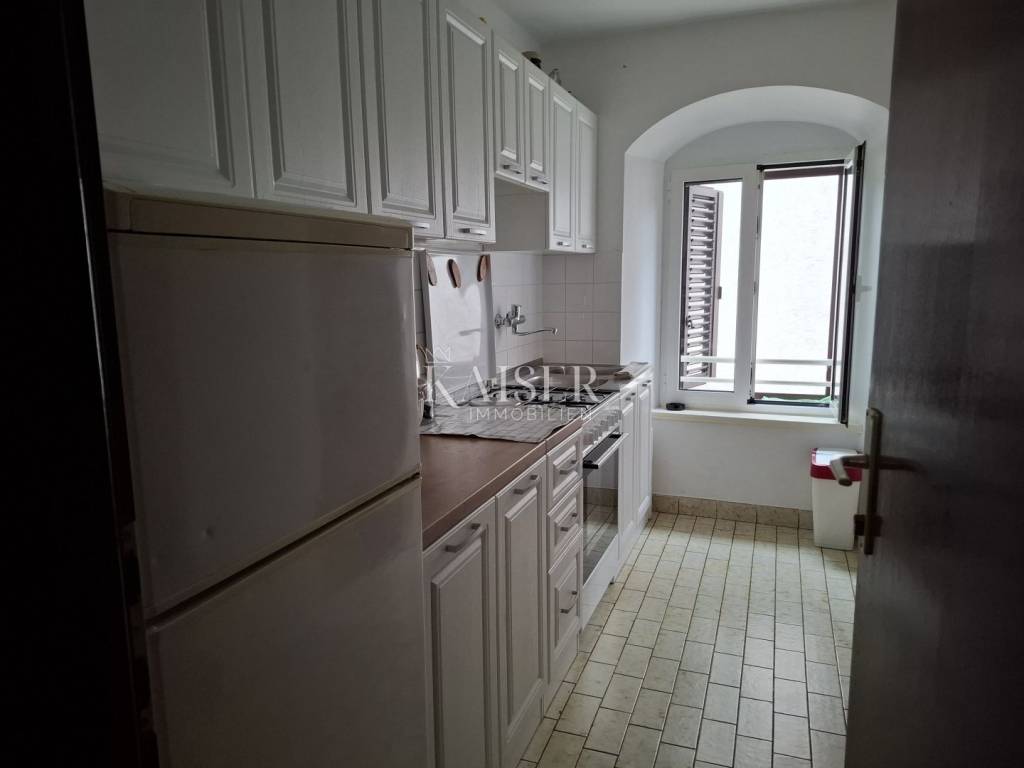 Kaiser-Immobilien predstavlja Vam stan od 67 m² u samom središtu grada Malog Lošinja. Stan se nalazi na 1. katu stambene zgrade, udaljen cca 70 m od glavnog gradskog trga, no na povučenoj i mirnoj lokaciji. Sastoji se od kuhinje, blagovaonice i dnevnog boravka, dvije sobe, dvije kupaonice, hodnika, te ostave koja je uređena kao manja dječja soba. Stanu pripada zajednički dio dvorišta te izdvojeni vrt od cca 4 m². Stan nema pristup vozilom niti parkirno mjesto, no isto je moguće zakupiti na jednom od obližnjih gradskih javnih parkirališta.
