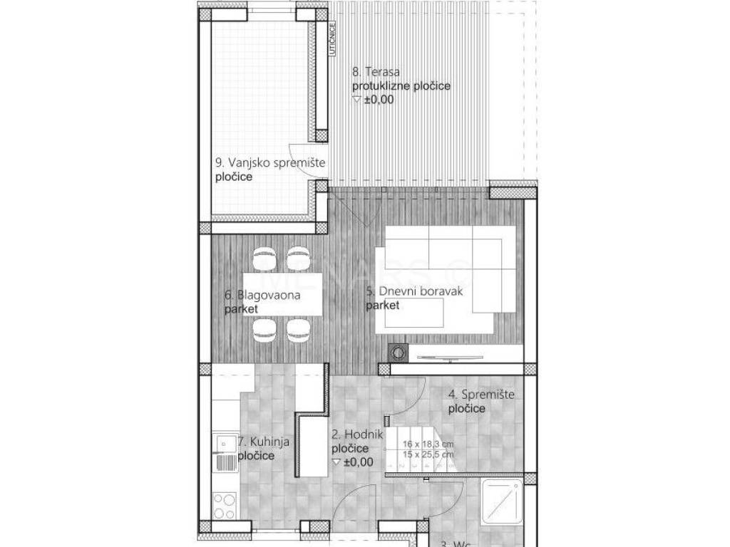 PRIZEMLJE: natkriveni ulaz, hodnik, wc, spremište ispod stubišta, dnevni boravak, blagovaonica, kuhinja, terasa - natkrivena, vanjsko spremište (tlocrt među slikama).