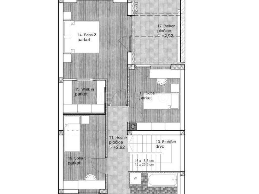 KAT: stubište, hodnik, kupaonica, 3 spavaće sobe, walk in i balkon.