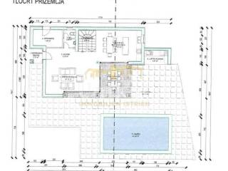 U prizemlju je predviđen otvoreni dnevni boravak s kuhinjom i blagovaonom te WC za goste. Iz boravka i kuhinje bi postojao direktan izlaz na natkrivenu terasu kraj sunčališta i bazena. Dodatno je u prizemlju planirano prostrano spremište u koje se ulazi s vanjske strane kuće.