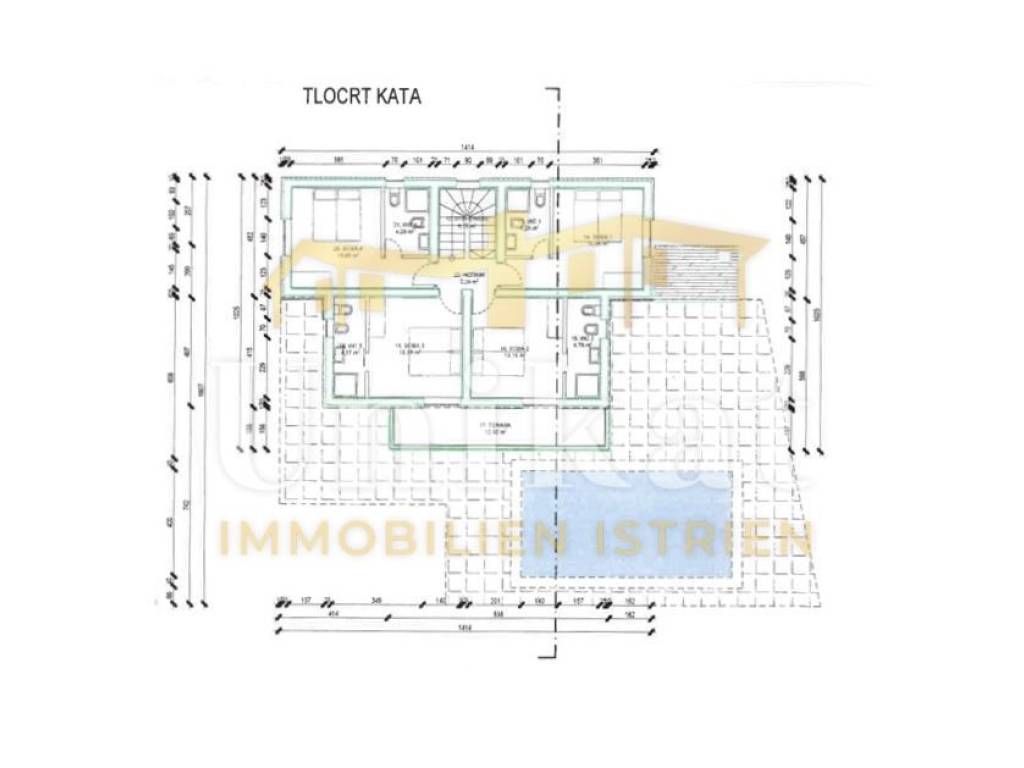 Na katu su predviđene četiri spavaće sobe od kojih svaka ima svoju privatnu kupaonicu, a dvije sobe imaju izlaz na zajednički balkon s pogledom na bazen i vrt.