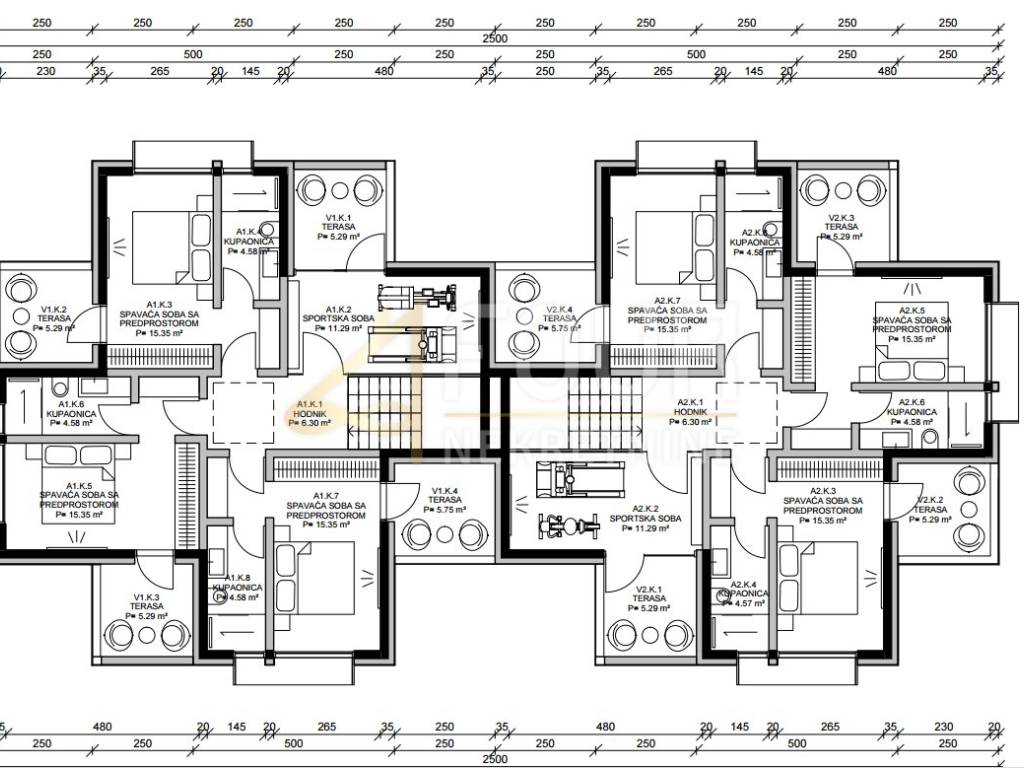 Na katu se nalaze tri prostrane spavaće sobe, svaka s vlastitim garderobnim predprostorom, kupaonicom i privatnom terasom (površine od 5.29 do 5.75 m2).