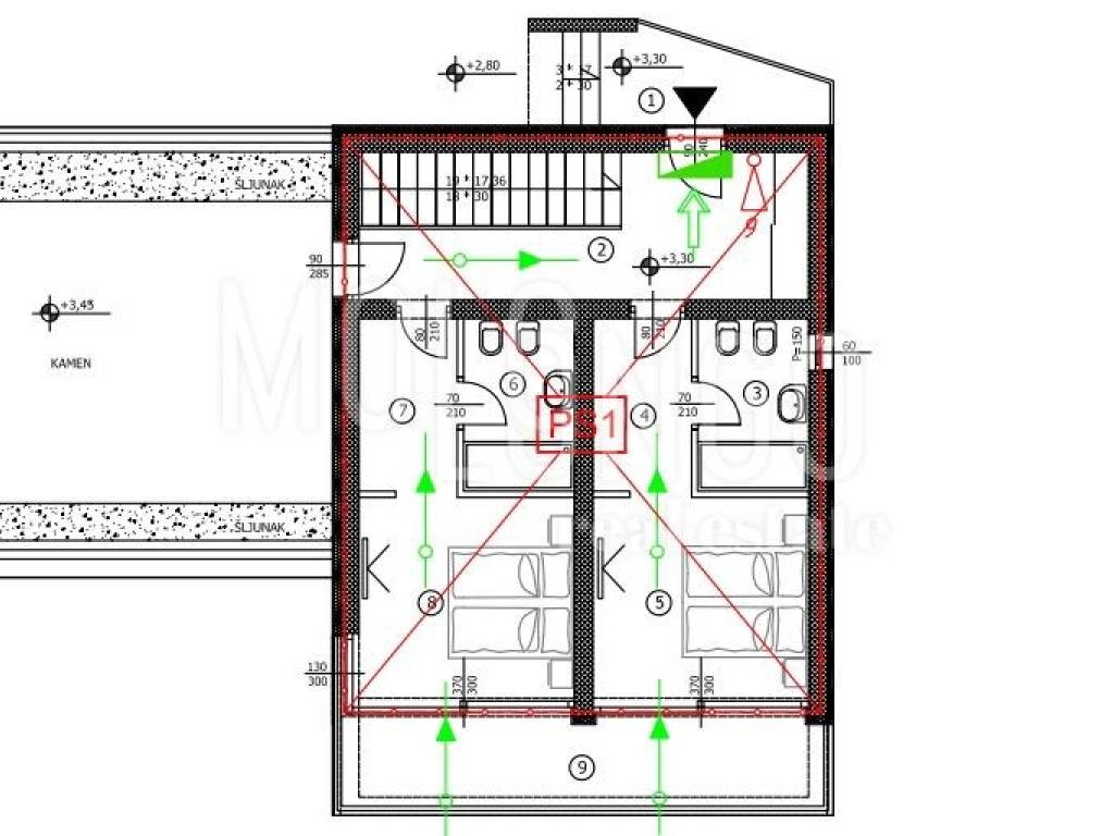 Na prvom katu, nalazi se glavni ulaz u kuću, hodnik te dvije dodatne spavaće sobe s vlastitim kupaonicama i balkonima, pružajući vam intimnost i udobnost na najvišoj razini.