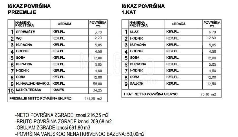 Neto površina kuće iznosi 141,25 m2 na prizemlju i 75,10 m2 na prvom katu, što ukupno čini 216,35 m2 luksuznog prostora za vašu udobnost i uživanje.