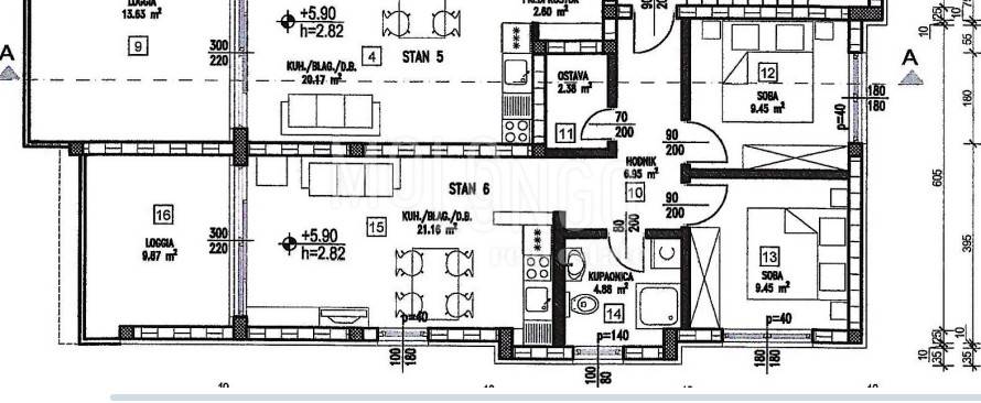 Stan se sastoji od hodnika, kupaonice, ostave, dvije spavaće sobe te dnevnog boravka s kuhinjom s izlazom na prostranu lođu.
