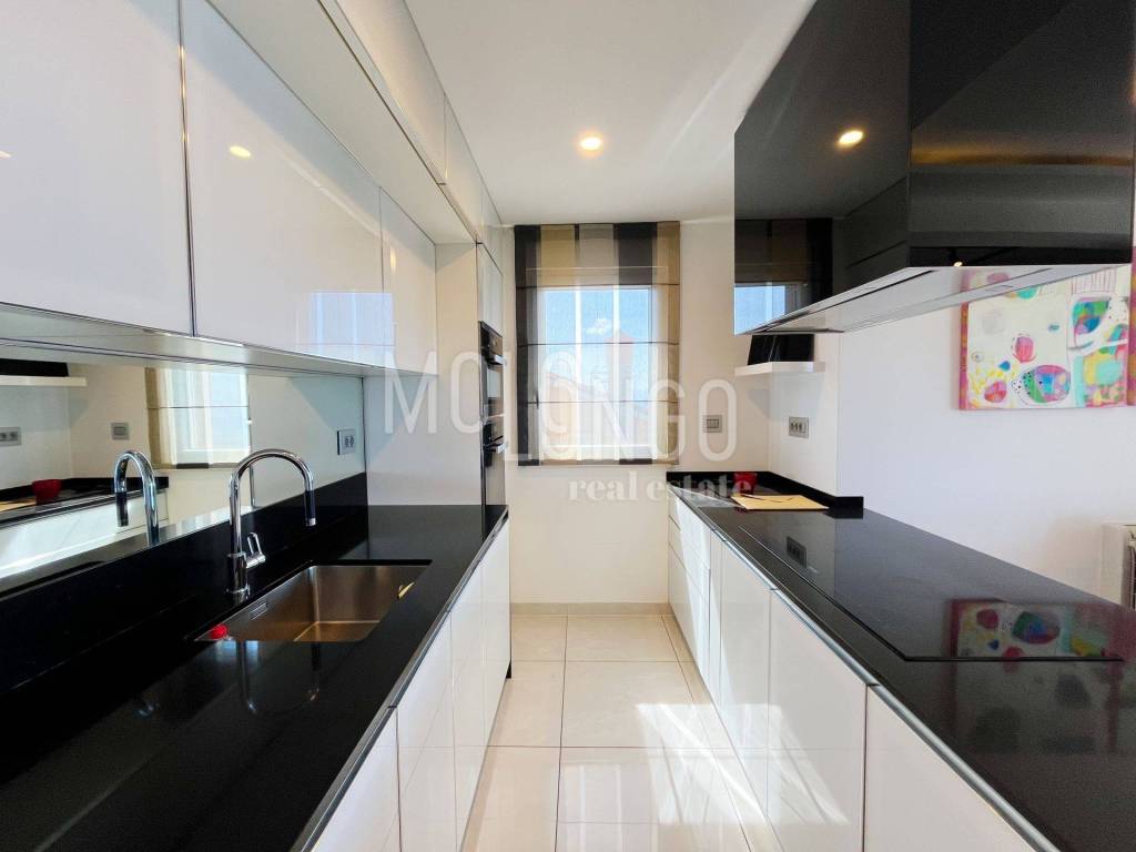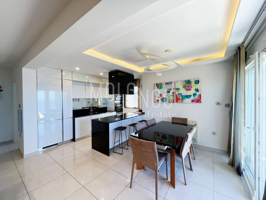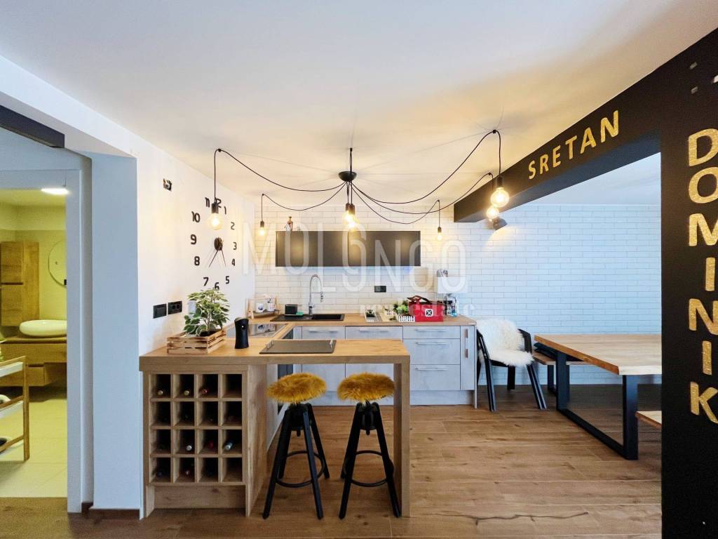 Stan je bogato opremljen i moderno uređen. Ima novu Scavolini kuhinju sa Miele aparatima, dizajnerski namještaj sa talijanskim potpisom, puno ugradbene LED rasvjete i slično..