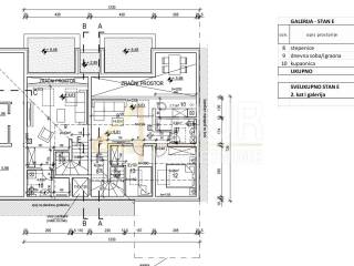 Dvoetažni stan ukupne površine 76.16m2. 2. kat površine 58.60m2 sastoji se od dnevnog boravka s kuhinjom i blagovaonicom, hodnika, kupaonice, dvije sobe i terase. Galerija površine 17.56m2 uključuje dnevni dio/igraonicu i kupaonicu.