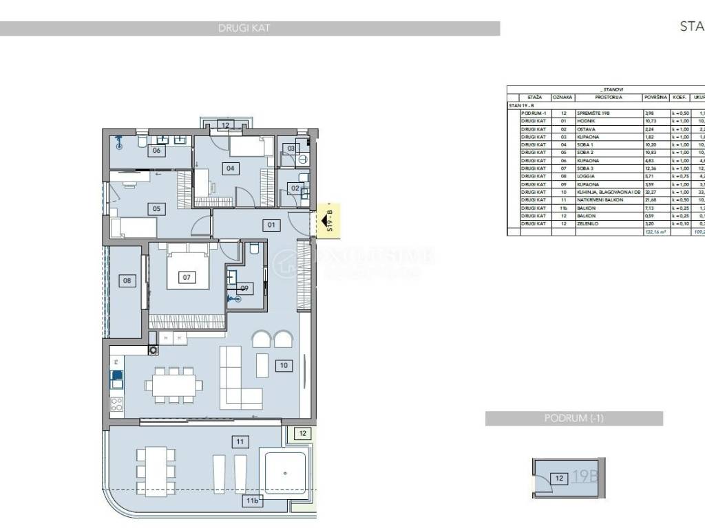Stambeni objekt ima dvije podrumske etaže na kojima se nalaze garažna parkirna mjesta iz kojih se s liftom dolazi direktno na etažu svakog stana.