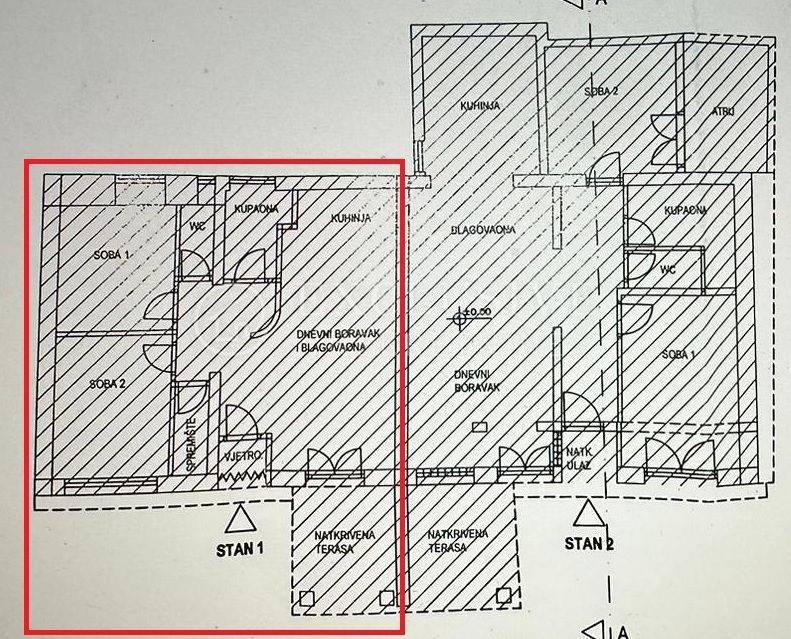 Stan ima zaseban ulaz preko lijepe prostrane terase na kojoj se smjestio kamenom zidani roštilj, a stambeni dio se sastoji od dnevnoga dijela kojega čine dnevni boravak, kuhinja i blagovaona, potom od spremišta, kupaone, wc-a te dvije spavaće sobe.