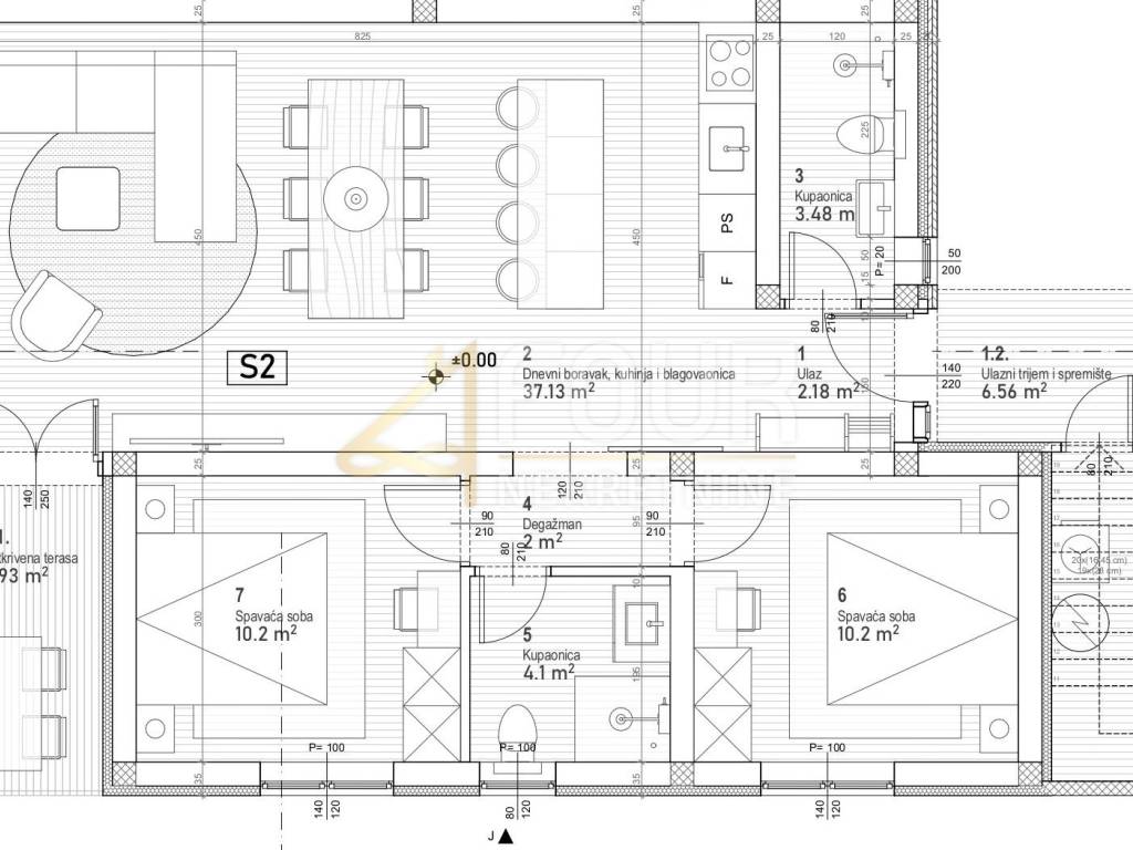 Sastoji se od dvije spavaće sobe, prostranog dnevnog boravka, kuhinje s blagovaonicom, dvije kupaonice te degažmana. Posebnost ove nekretnine je terasa od 8.93m2 s jugo-zapadnom orijentacijom, koja omogućava uživanje u sunčanim danima.