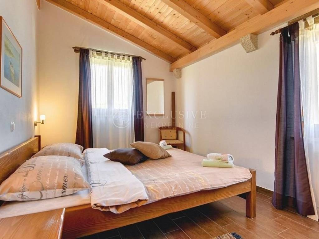 Kuća se sastoji od dva dijela - dvije dvoetažne stambene jedinice, konobe s roštiljem i pomoćnog apartmana.