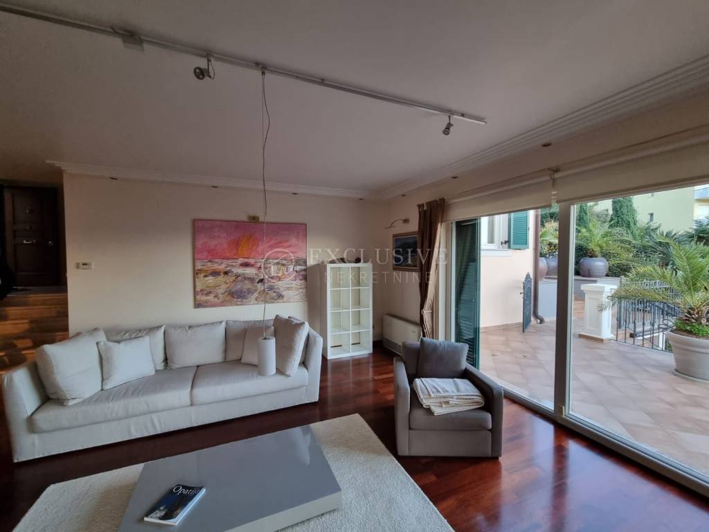 Vila je na padini, a budući da stan prati okolni teren, dnevni boravak s kuhinjom, blagovaonicom i okolnim terasama nalazi se na polukatu, niže od spavaćeg dijela stana, što nedvojbeno pridonosi atraktivnosti i atraktivnosti. praktičnost ove nekretnine.