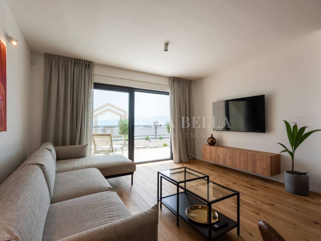Prizemlje: Otvoreni koncept dnevnog boravka, moderno opremljena kuhinja i blagovaonica s izlazom na prostranu terasu. Na terasi se nalazi grijani bazen, savršen za opuštanje uz pogled na more. Također, u prizemlju je i toalet za goste.