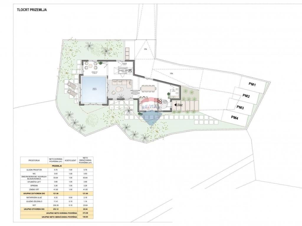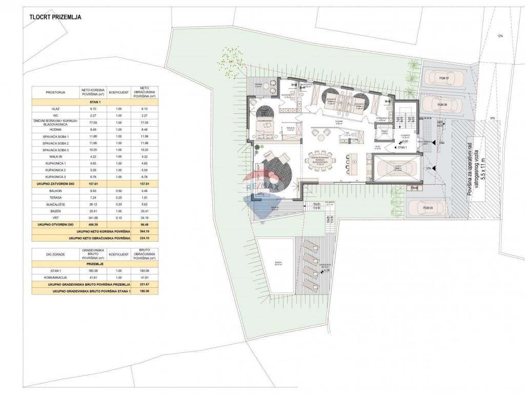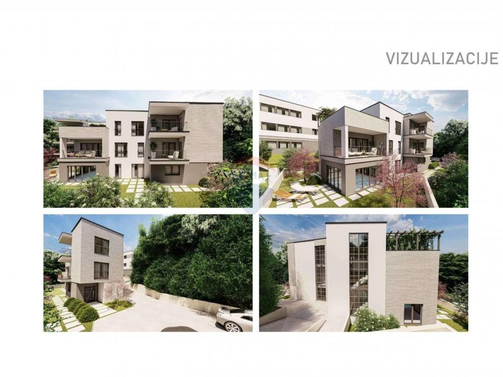 -stambenu zgradu (podrum, prizemlje, 1.kat, 2.kat) sa sveukupno 3 stana (3S+DB stanovi s 3 kupaone, balkonima i terasama), bazenom, garažom, liftom, auto dizalom, ukupne bruto građevinske površine 882.71 m2