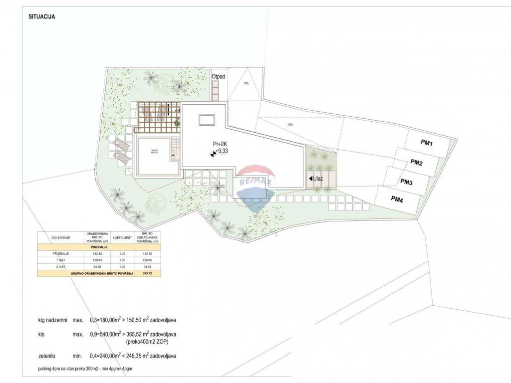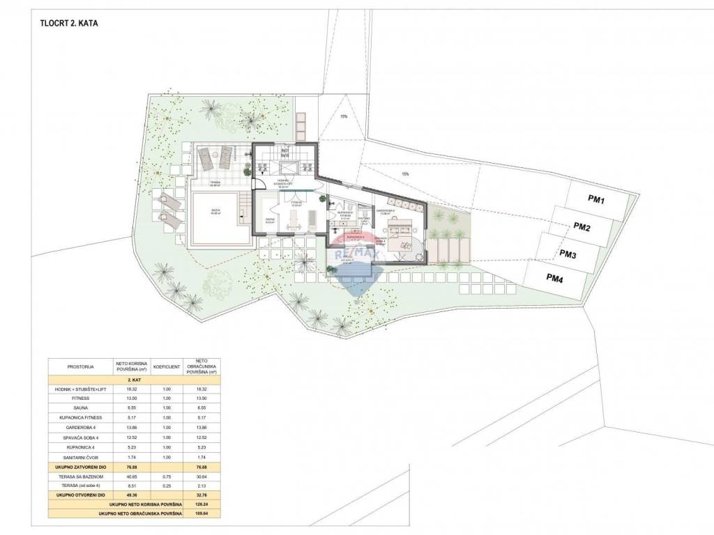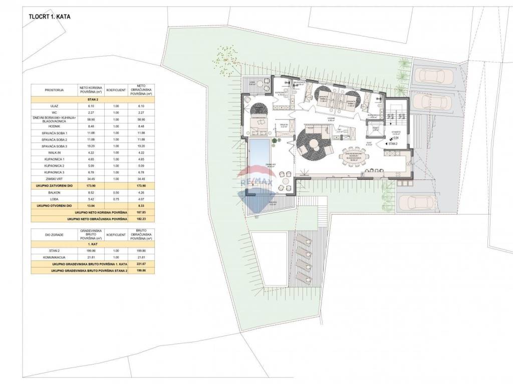 - vilu (podrum, prizemlje, 1.kat, 2.kat) s jednim 4S+DB stanom, 2 bazena, saunom, fitnessom i liftom ukupne bruto građevinske površine 365.73 m2