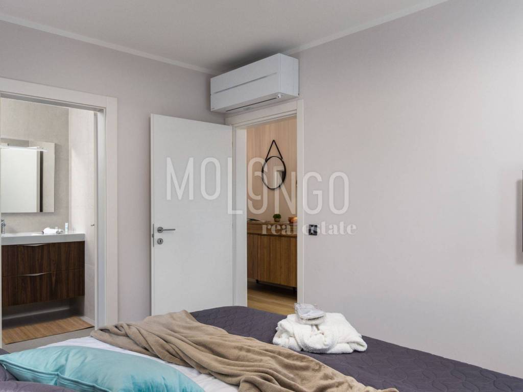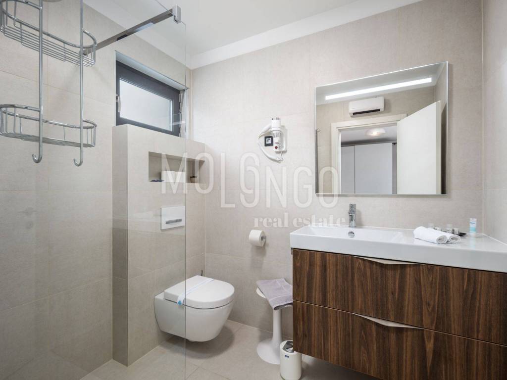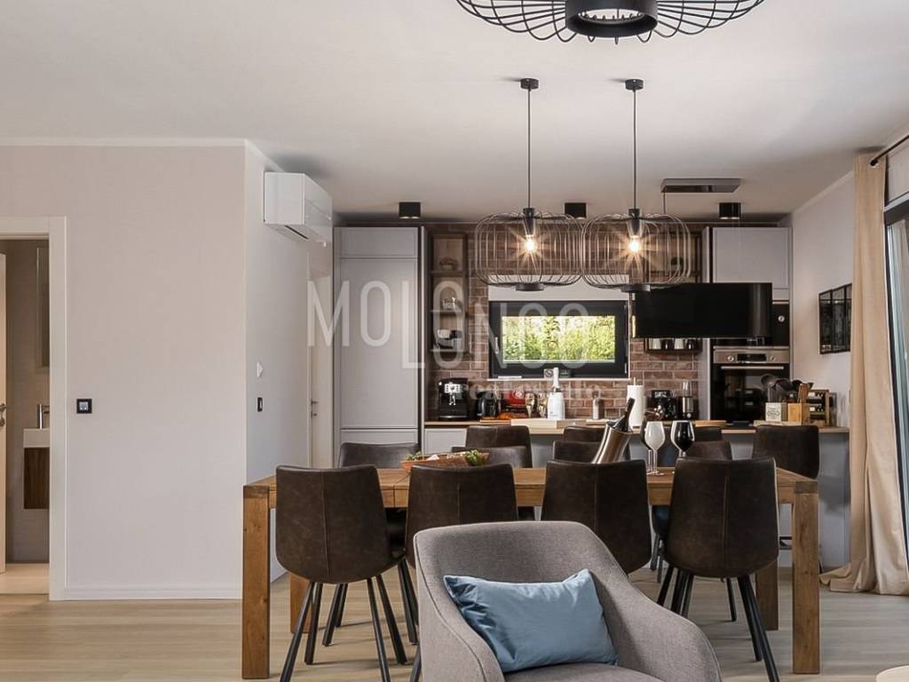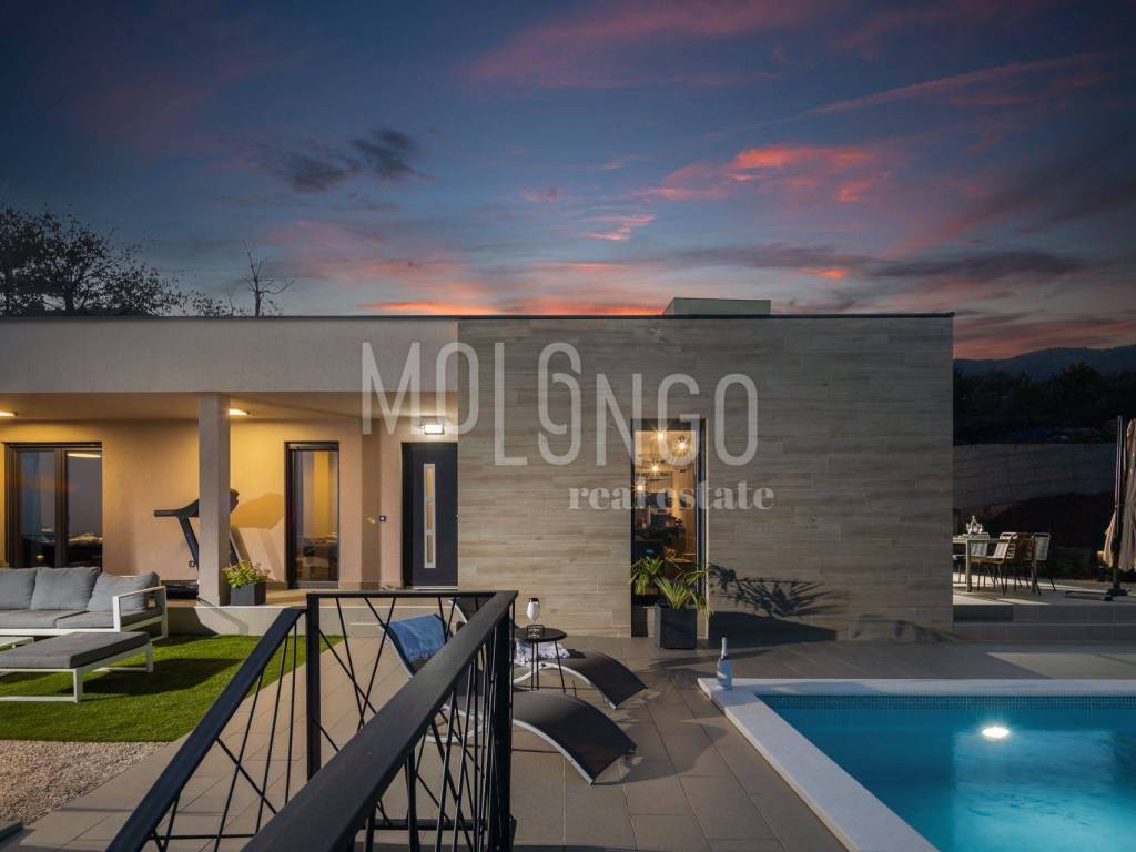 Villa je opremljena modernim i kvalitetnim namještajem. Elegantnog i ugodnog izgleda. Svaka prostorija ima klima uređaje i podno grijanje. Na okućnici Ville smješten je predivan bazen 32m2 sa sunčalištem. Bazen je idealan za osvježenje i uživanje u ljetnim mjesecima. Okućnica je uređena i do najmanjih detalja. Sa terase se pruža spektakularan pogled na more.