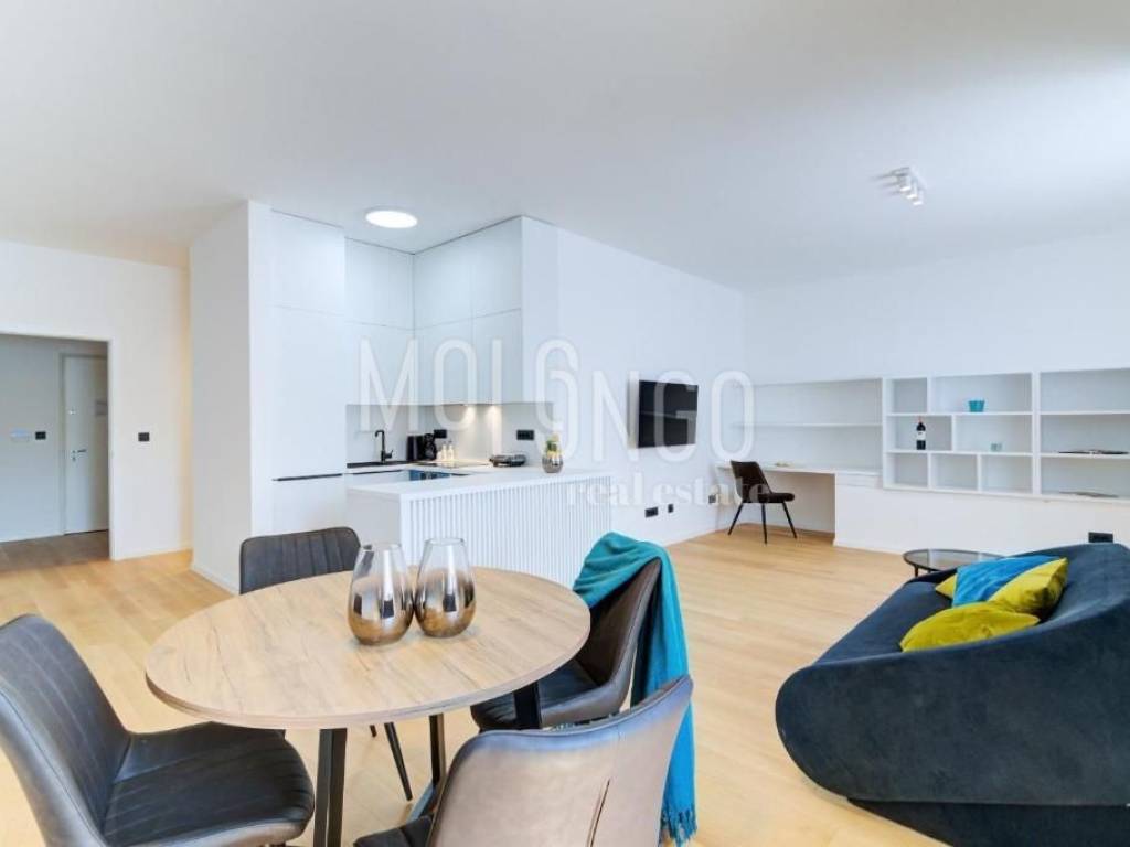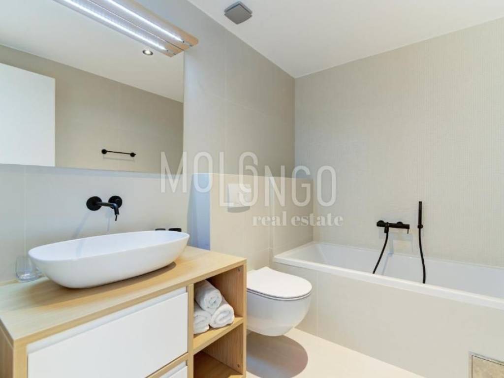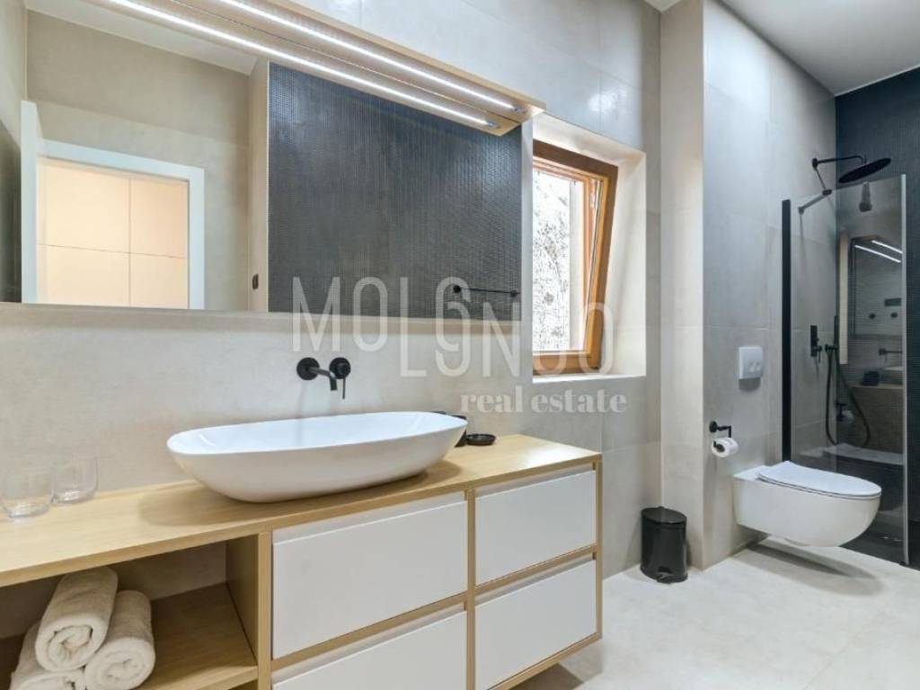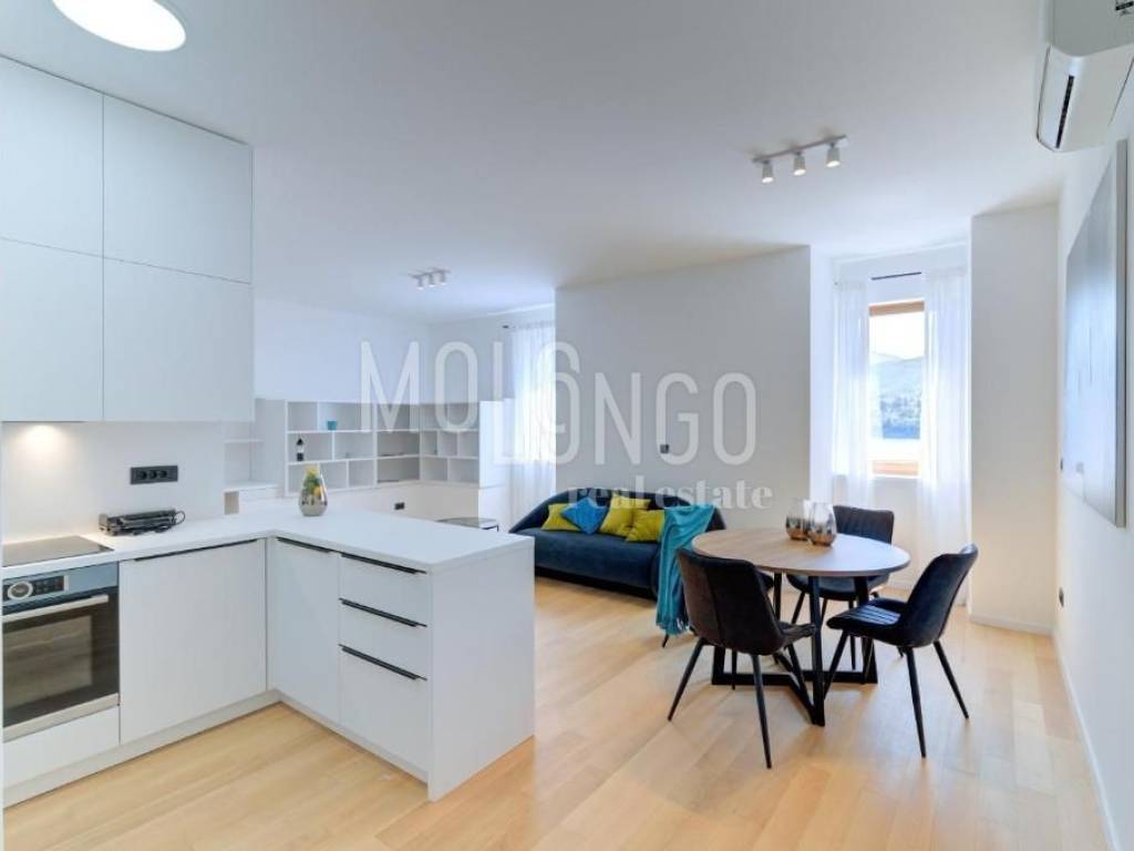 Apartman površine 102,30 m2 nalazi se na drUgom katu te se sastoji od ulaza, hodnika, prostranog dnevnog boravka s kuhinjom i blagovaonicom, tri spavaće sobe i kupaonice.