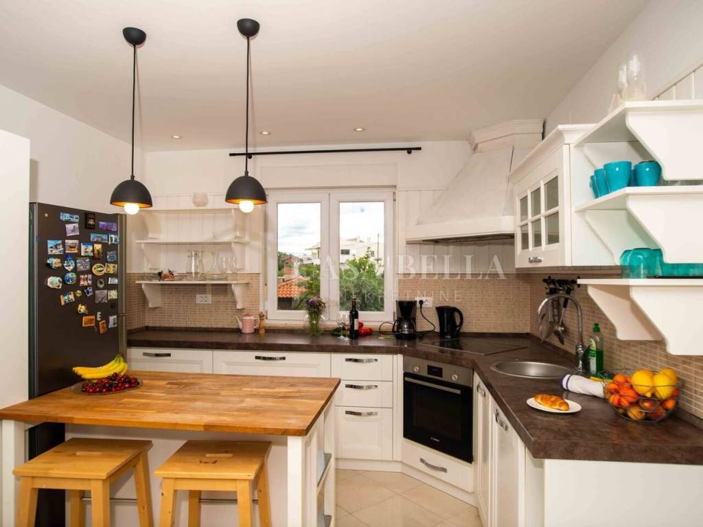 Stan se sastoji od tri spavaće sobe, prostranog dnevnog boravka s kuhinjom i blagovaonom okupanom suncem, natkrivene i nenatkrivene terase s pogledom na more, kupaonice i odvojenog WC-a. U vlasništvu su i dva parkirna mjesta te posebna prostorija u podrumu od 23 m² koja može služiti kao konoba ili velika ostava.