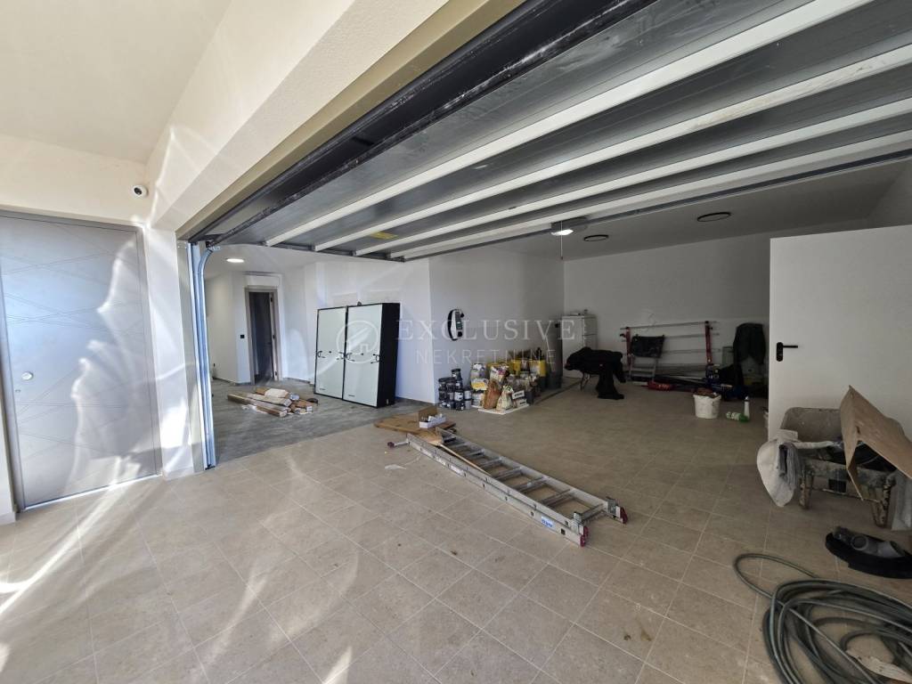 Podrumska etaža uključuje ulazni prostor s direktnim pristupom prostranoj garaži. U prizemlju se nalazi elegantno oblikovana dnevna zona — veliki, svijetlom ispunjen dnevni boravak povezan s kuhinjom i blagovaonicom, garderoba, gostinjski WC te izlaz na natkrivenu terasu koja odiše mirom i intimom. Na katu su smještene tri prostrane spavaće sobe, svaka sa svojom modernom kupaonicom, dok loggia pruža panoramski pogled na beskrajni plavi horizont.