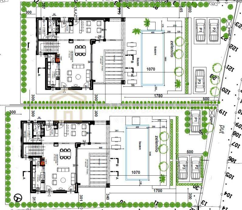 OKUĆNICA -privatno parkiralište za 4 auta -visokovrijedno zelenilo sa palma -priprema za design roštilj velikog formata -design opločnici velikog formata sa skrivenim uljnim šahtovima -veliki ulazni pješački portal sa interfonom i kamerom -automatska el. vrata za kolni ulaz