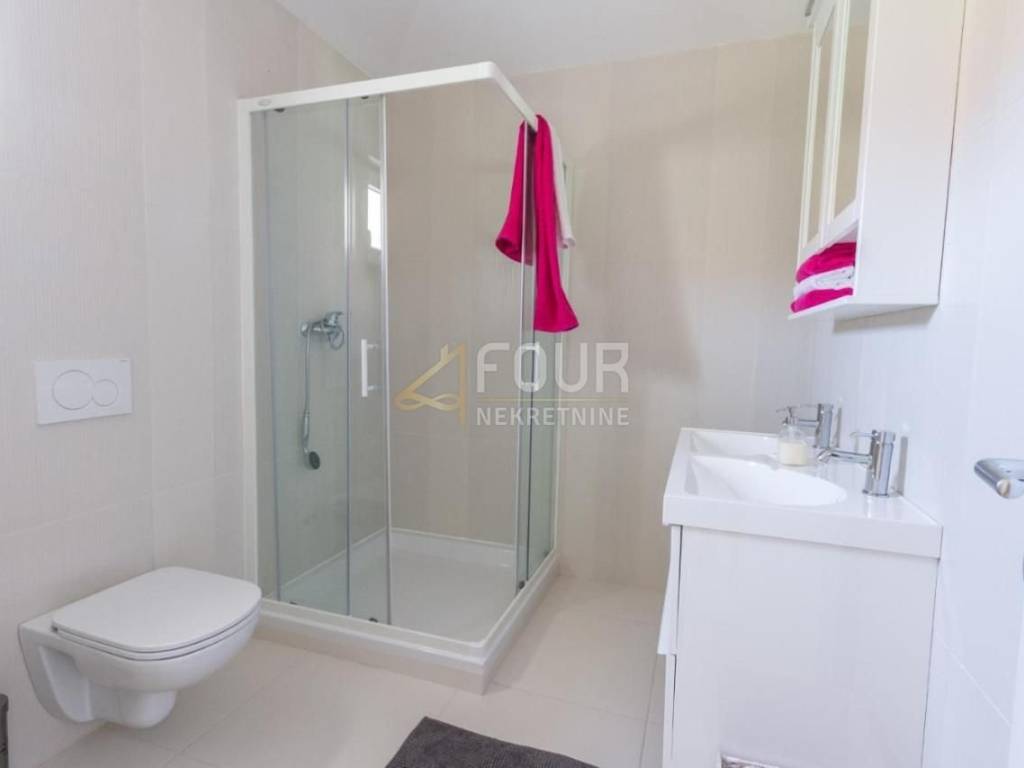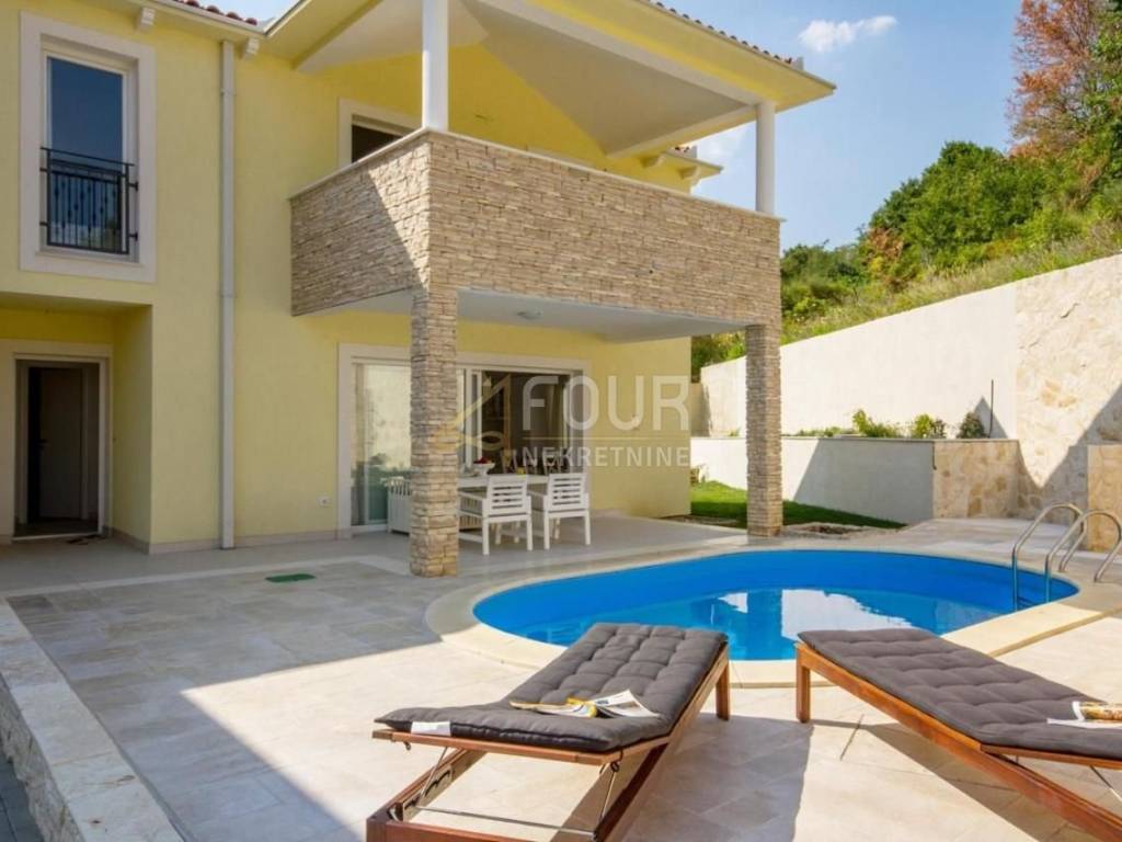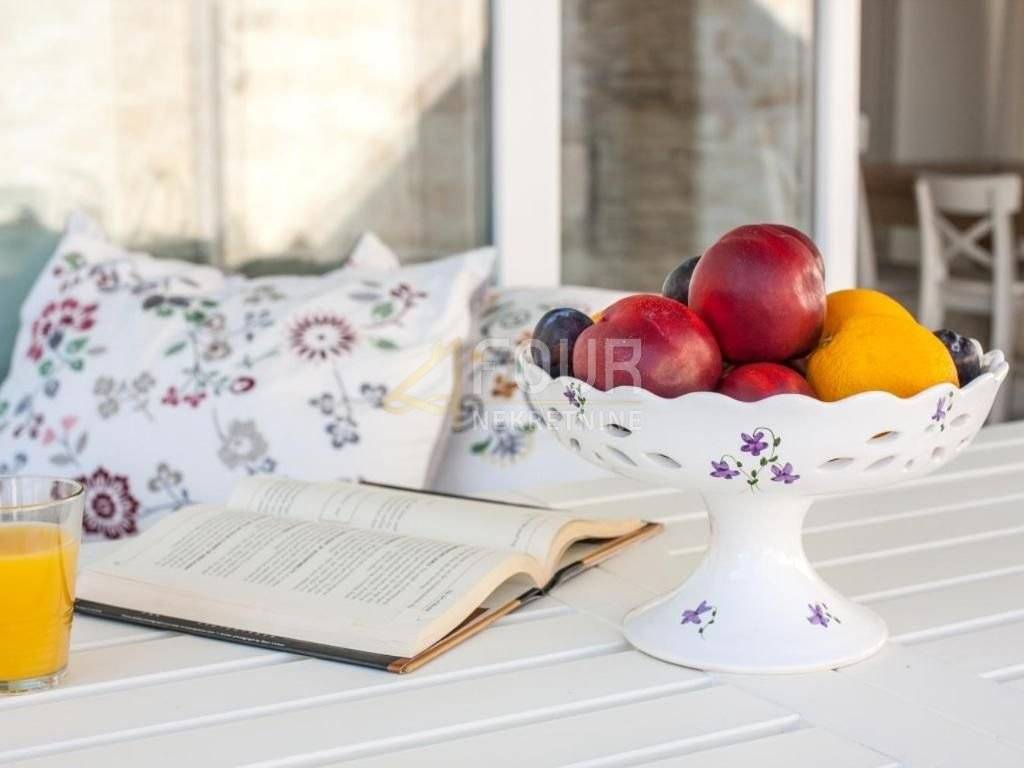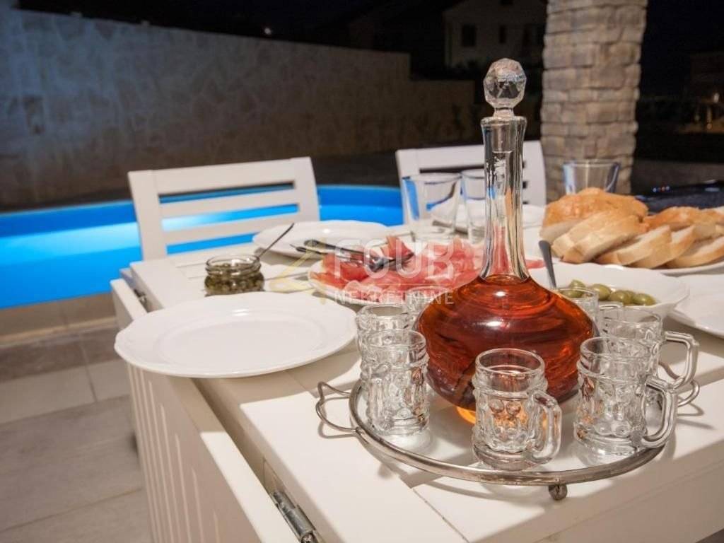 Dnevni dio ima direktni izlaz na okućnicu, grijani bazen sa sunčalištem, natkrivenu terasu i roštilj.