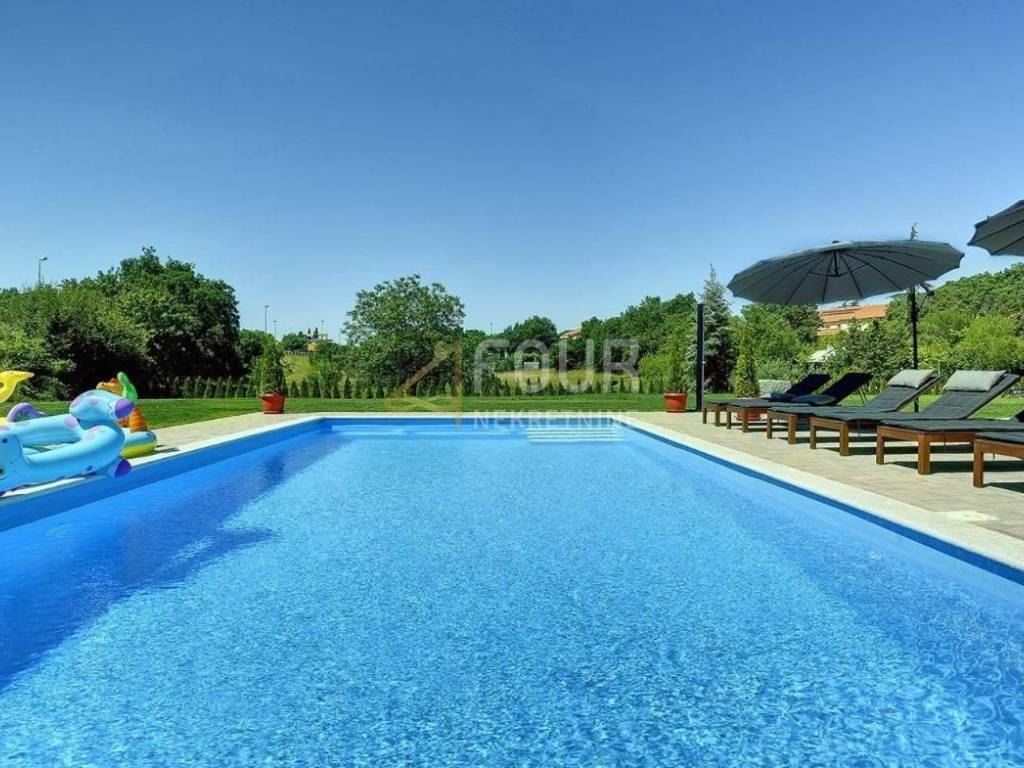 Okućnica je prekrasna zelena oaza, na kojoj se nalazi izuzetno veliki bazen od 54m2, sunčalište s pergolom i natkrivena terasa.
