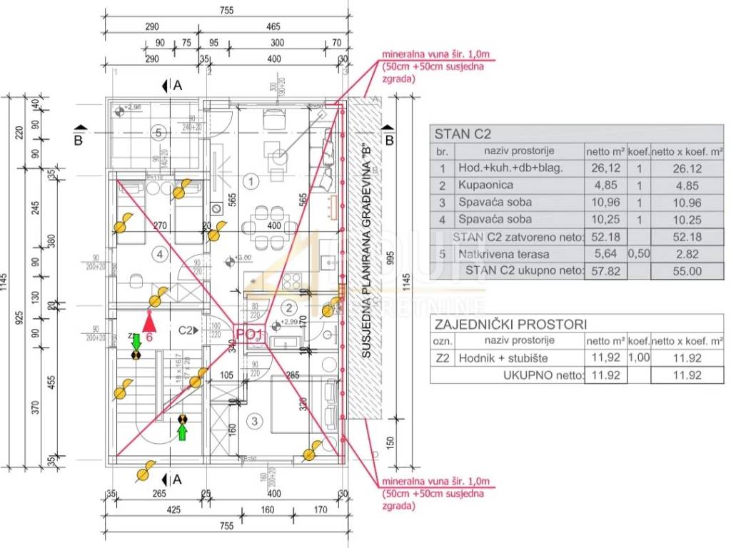 Ovaj stan sastoji se od dvije spavaće sobe, dnevnog boravka s kuhinjom i blagovaonicom u otvorenom prostoru, kupaonice i natkrivene terase. Također ovom stanu pripada spremište i vanjsko parkirno mjesto. Navedena cijena se odnosi na potpuno uređenu nekretninu, tzv. sistem ključ u ruke.
