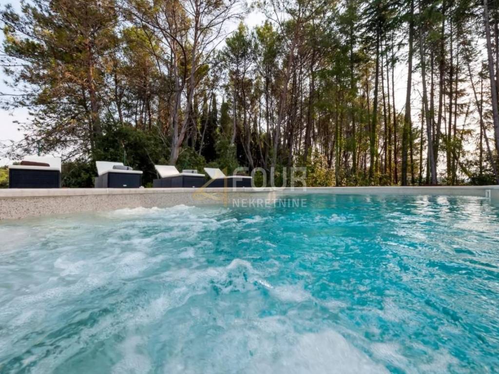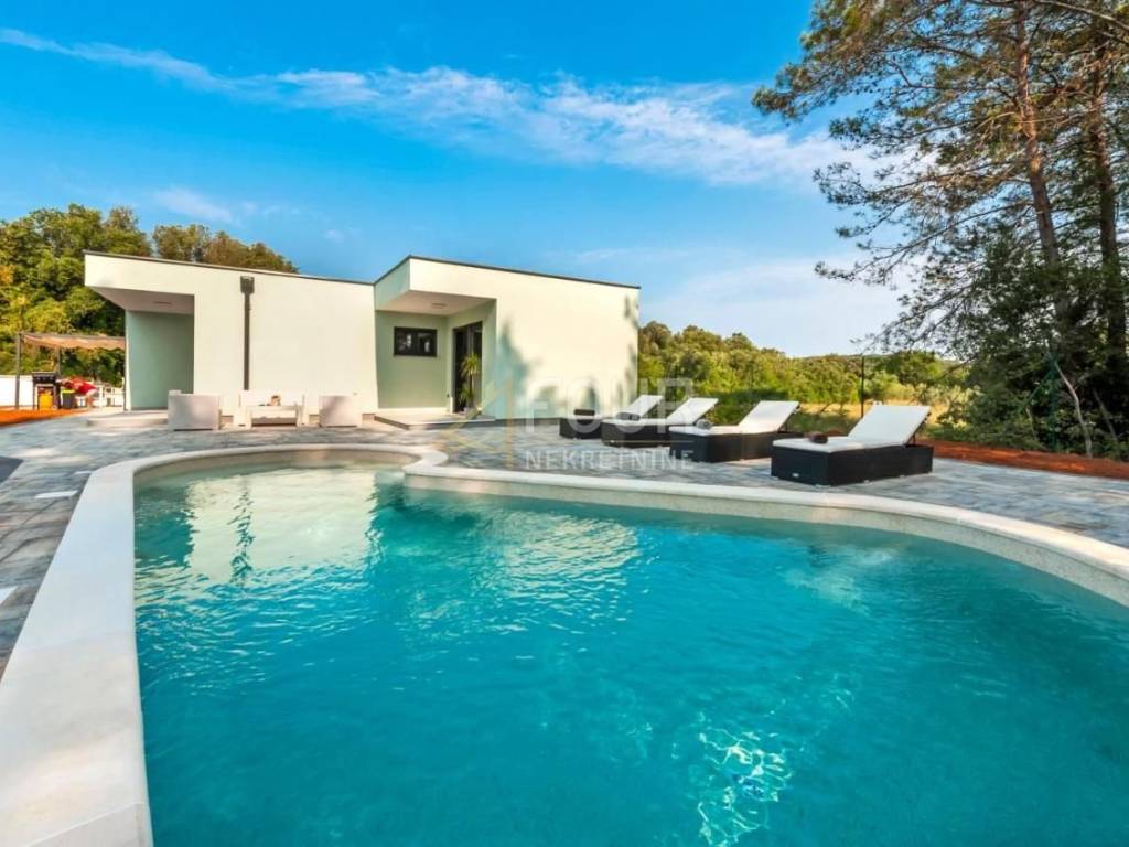 U ponudi je moderna vila, prizemnica s bazenom smještena na lijepoj i mirnoj poziciji, izvan gradske vreve, okružena borovom šumom, 700 metara udaljena od plaže i 2.5 km od centra Rovinja.