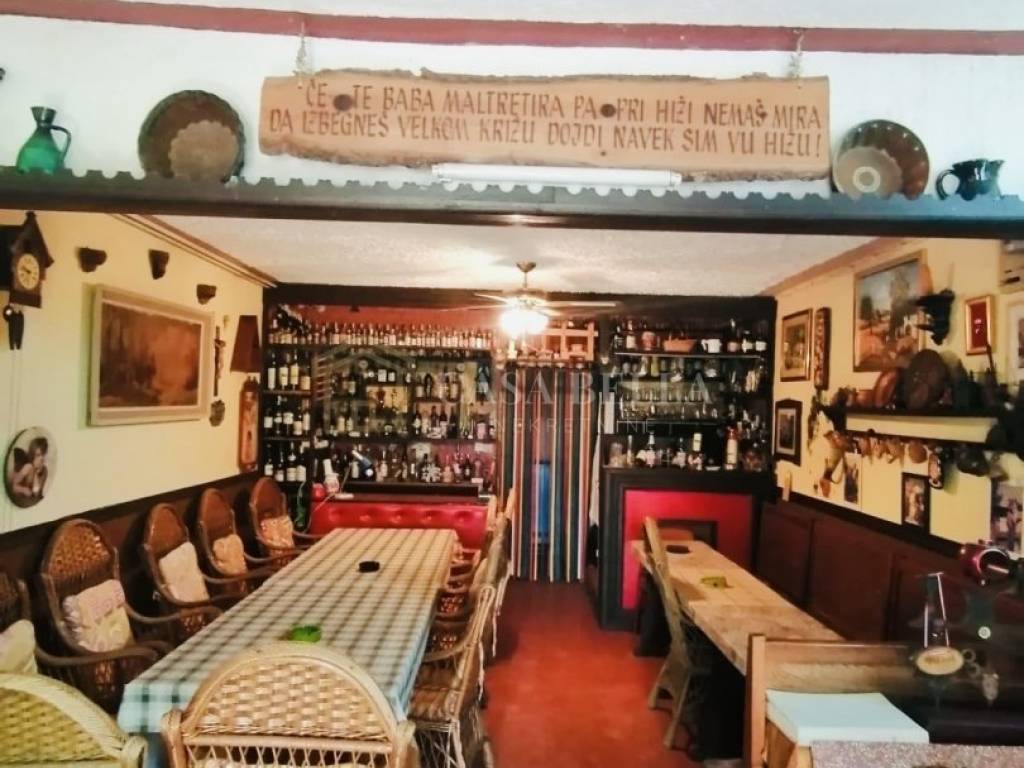 Prizemlje:prostor za druženje sa šankom,stolovima i stolicama i mali wc.