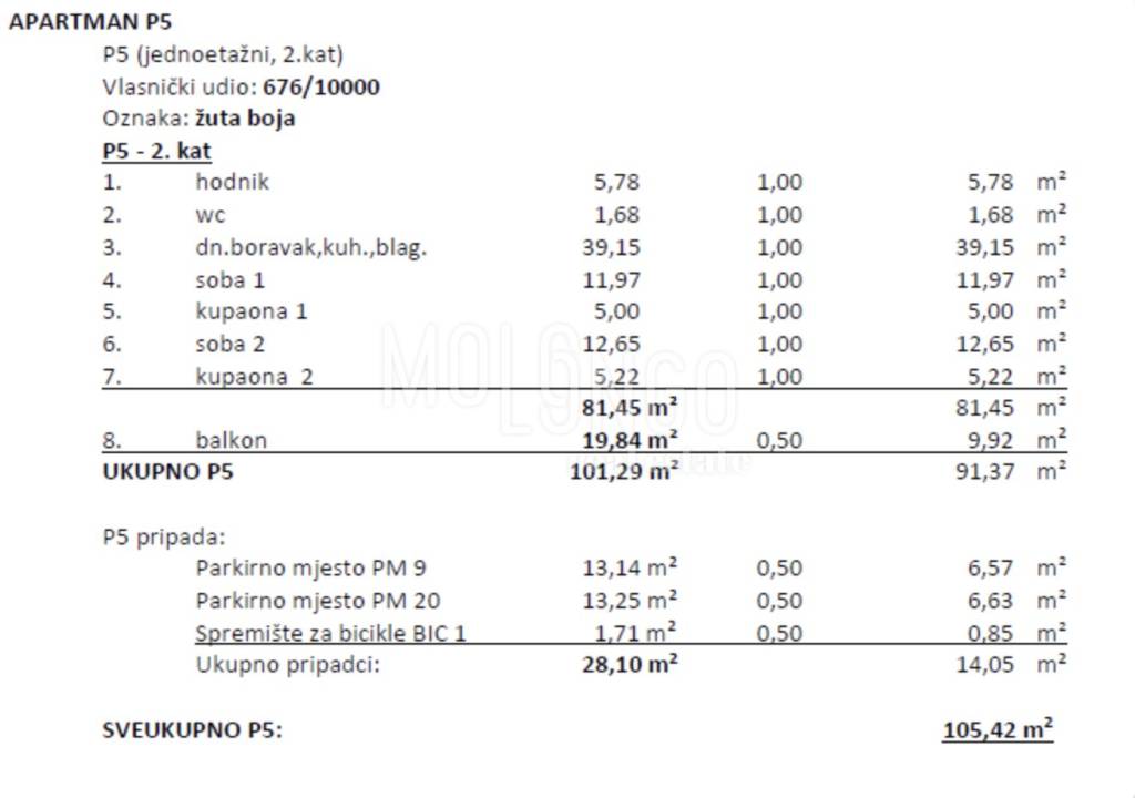 Stan se sastoji od hodnika, WC-a, dnevnog boravka s kuhinjom i blagavaonom, dvije sobe i dvije kupaonice, balkona, te dva mjesta u podzemnoj garaži.