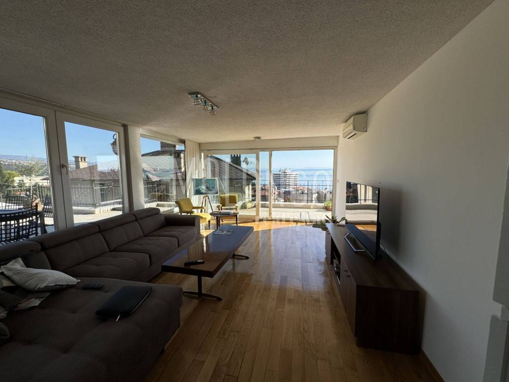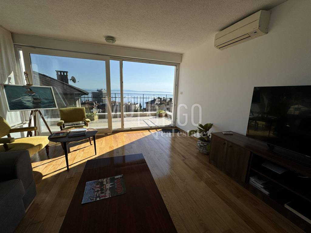 Veliki dnevni boravak južno orijentiran i cijeli u staklu nudi komfor, puno dnevnog svjetla i topline, te fantastičan pogled na more i Opatiju.