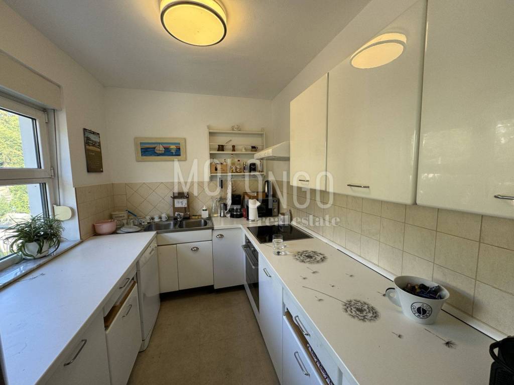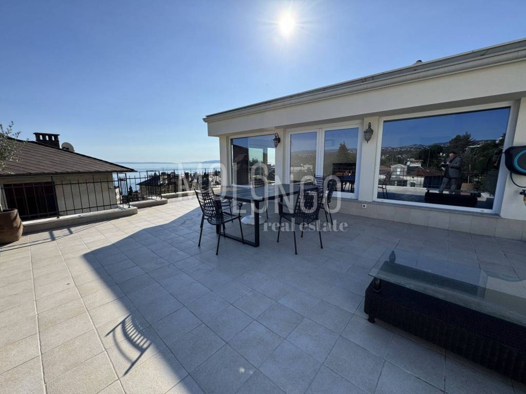 Iz dnevnog boravka se izlazi direktno na veliku terasu od 50 m2 s koje se pruža fantastičan pogled na more, cijelu Opatiju i Rijeku.