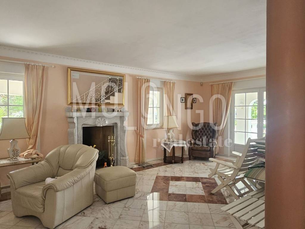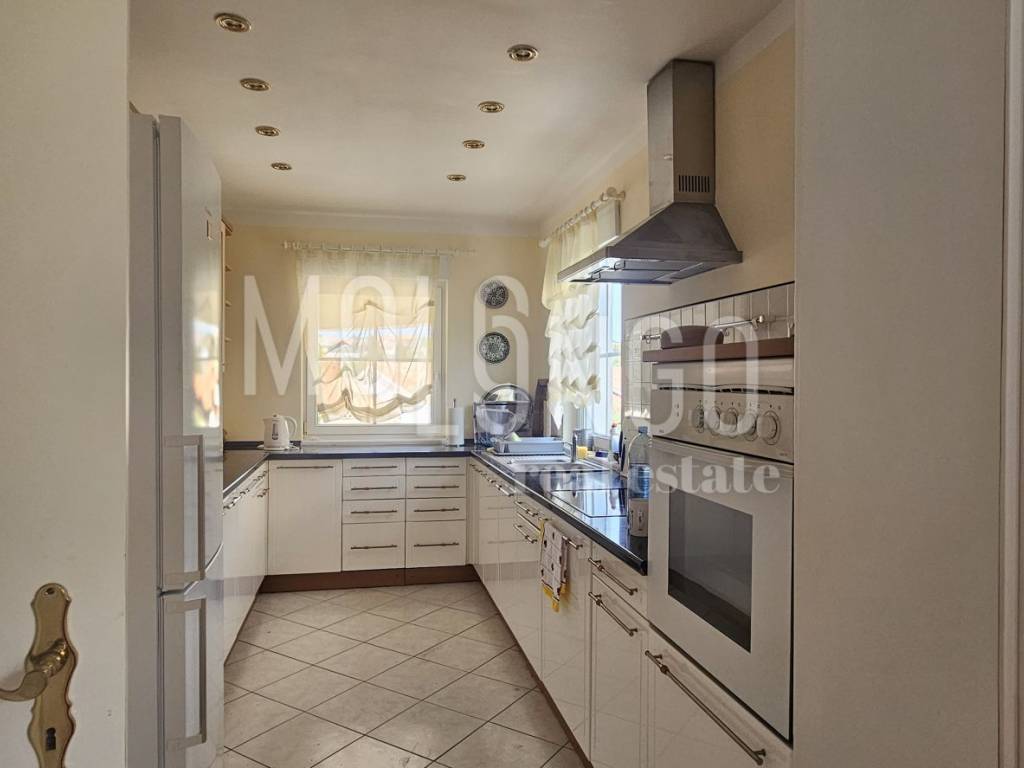Prizemlje: prostrani dnevni boravak s izlazom na natkrivenu terasu od 60 m², luksuzno opremljena kuhinja, gostinjski toalet i radna soba.