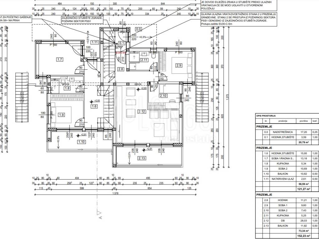 Unutarnje stepenice vode na gornju etažu koja se sastoji od hodnika, 2 spavaone,velike kupaone te dnevnog boravka iz kojeg se ide na natkriveni balkon površine 12m2.