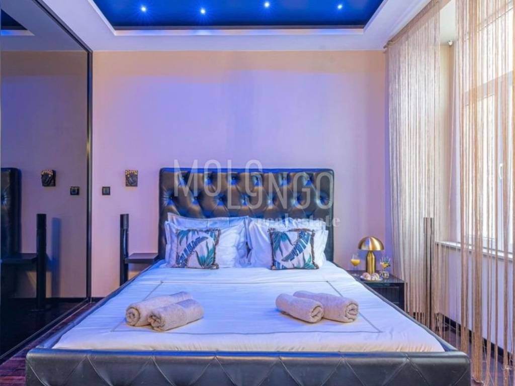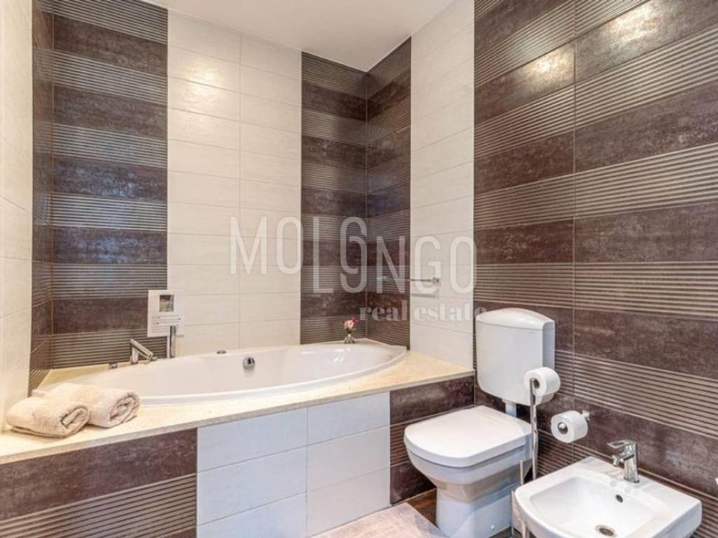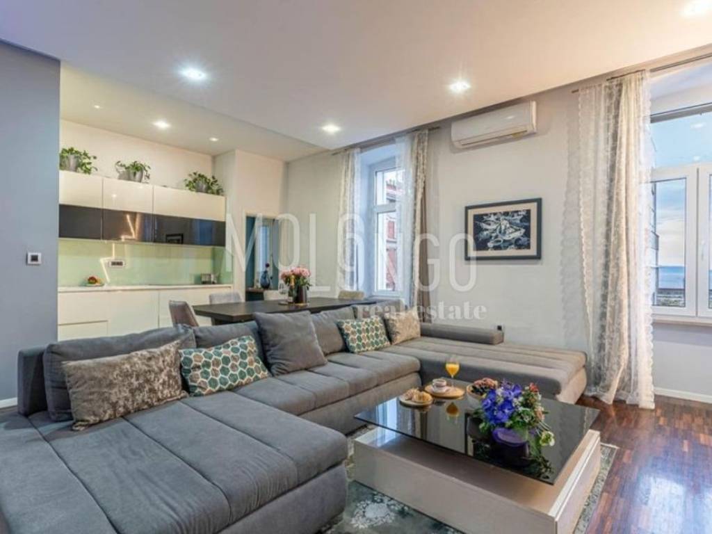 Iznajmljuje se luksuzan stan površine 105 m², smješten u blizini kazališta s predivnim pogledom na more i buduću marinu. Stan je južno orijentiran i nalazi se na trećem katu. Sastoji se od dvije spavaće sobe, dvije kupaonice (jedna s jacuzzijem, druga s tušem), prostranog dnevnog boravka povezanog s modernom kuhinjom te ostave za dodatno spremanje.