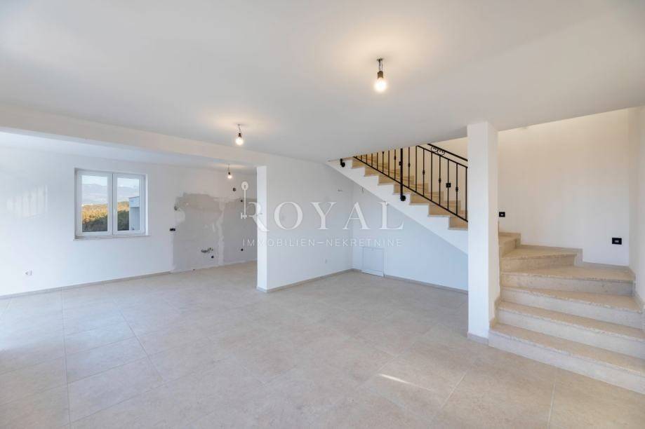 • Prva etaža: prostrani dnevni boravak, kuhinja s blagovaonom i izlazom na terasu s pogledom, ostava, WC, radna soba s posebnim vanjskim ulazom, terasa u vrtu među maslinama, 2 parkirna mjesta