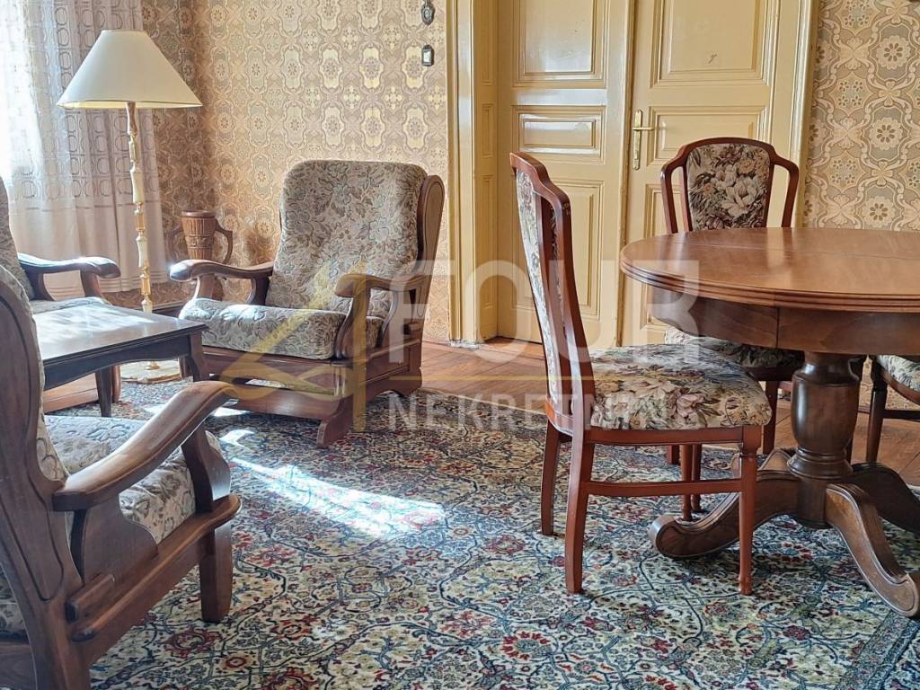 Sastoji se od niza prostranih prostorija s visokim stropovima – kuhinje s blagovaonicom, dnevnog boravka, tri spavaće sobe, hodnika i kupaonice.