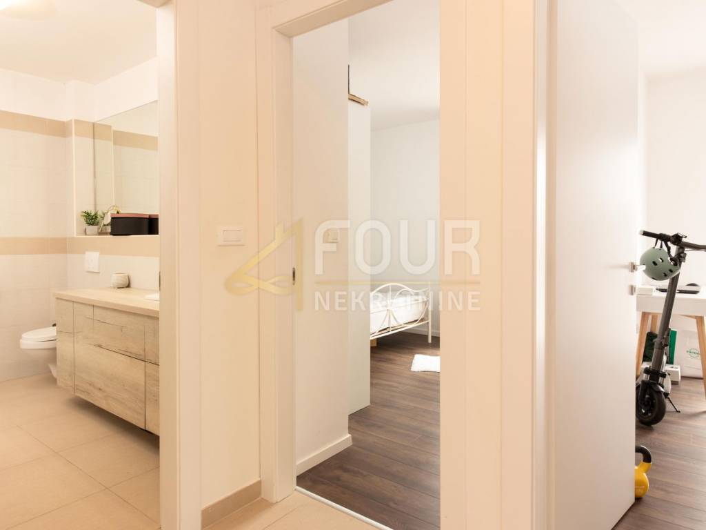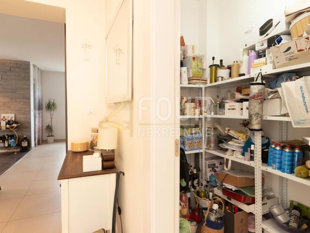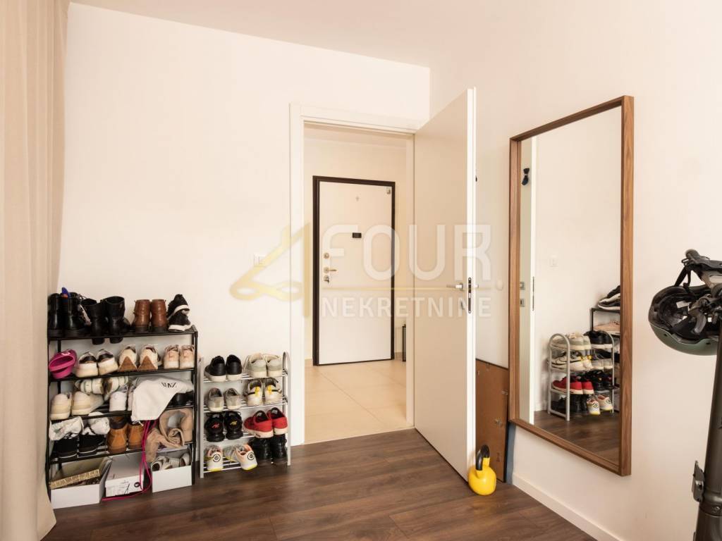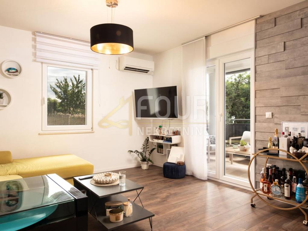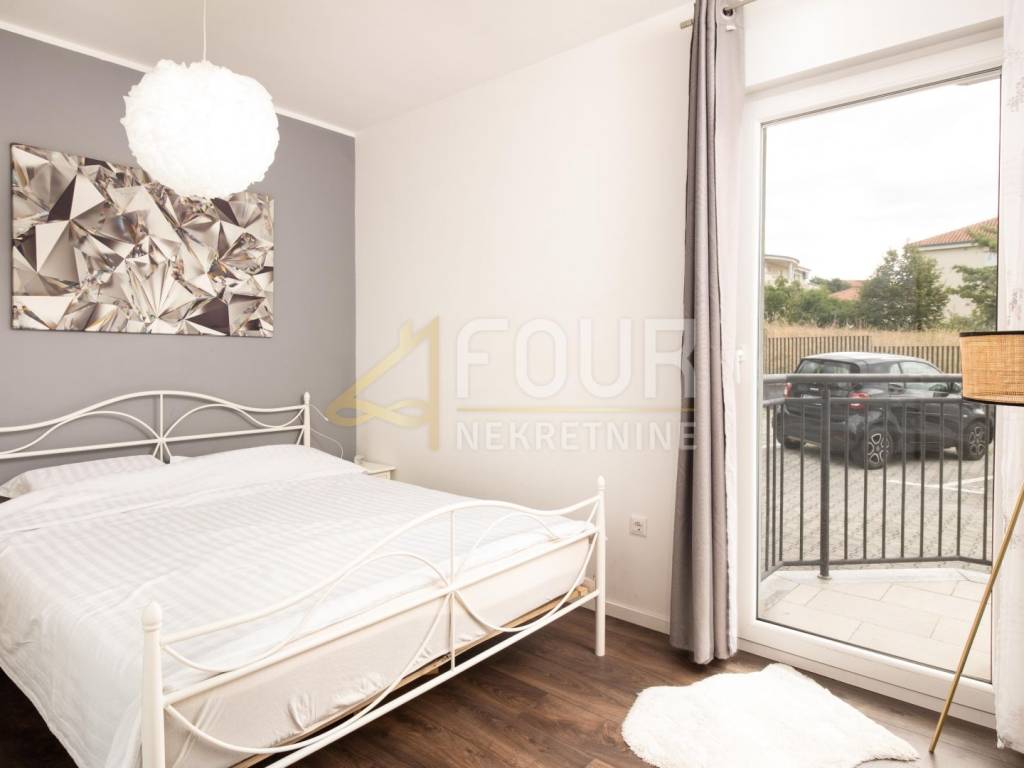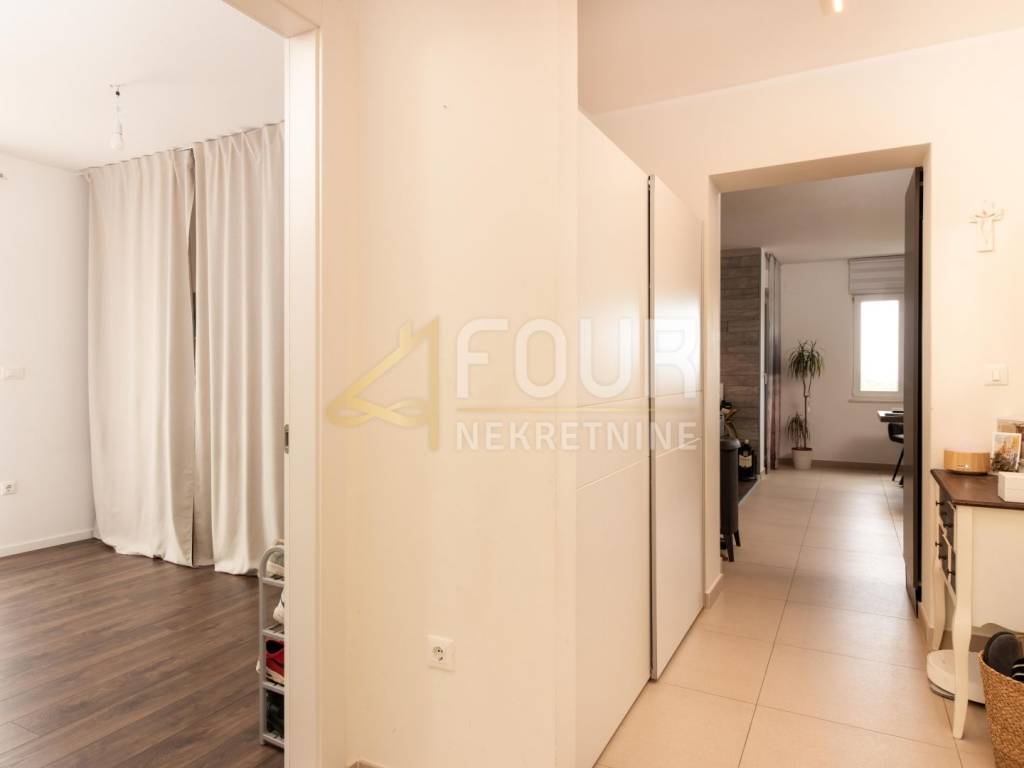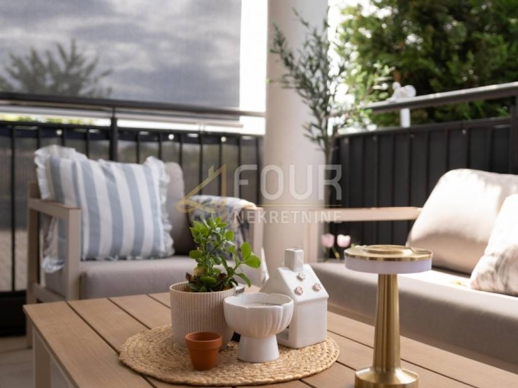 Sastoji se od hodnika, dvije komforne spavaće sobe, kupaonice s podnim grijanjem, kuhinje povezane s blagovaonicom i dnevnim boravkom, te izlazom na balkon i natkrivenu terasu s vertikalnim tendama koje osiguravaju dodatnu privatnost i zaštitu od sunca.